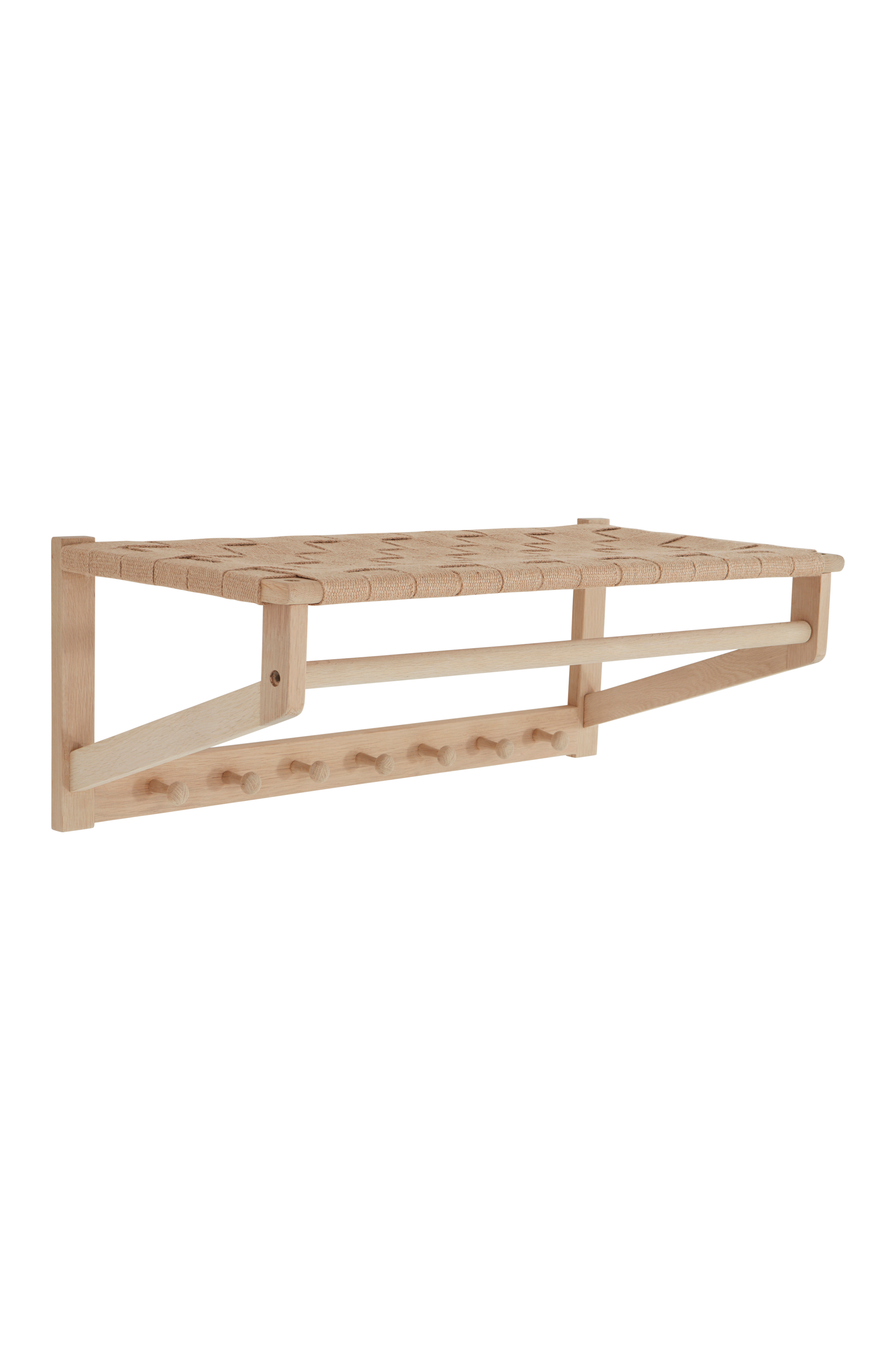 Hattuhylly FSC-sertifioitua massiivitammea. Ylin hylly on punottu leveästä, reilusta juutista valmistetusta satulavyöstä. OSLO on aito ja rustiikki sarja hienoa lipeäkäsiteltyä tammea, joka luo pehmeän harmaanbeigen sävyn. Tammi yhdistettynä satulavyöhön on oikein onnistunut yhdistelmä. OSLO-hyllyssä on tanko ripustimille, seitsemän koukkua ja hylly asusteille, kuten käsineille ja pipoille. Jokaisessa koukussa on pyöreä pää, jotta vaatteet eivät putoa.