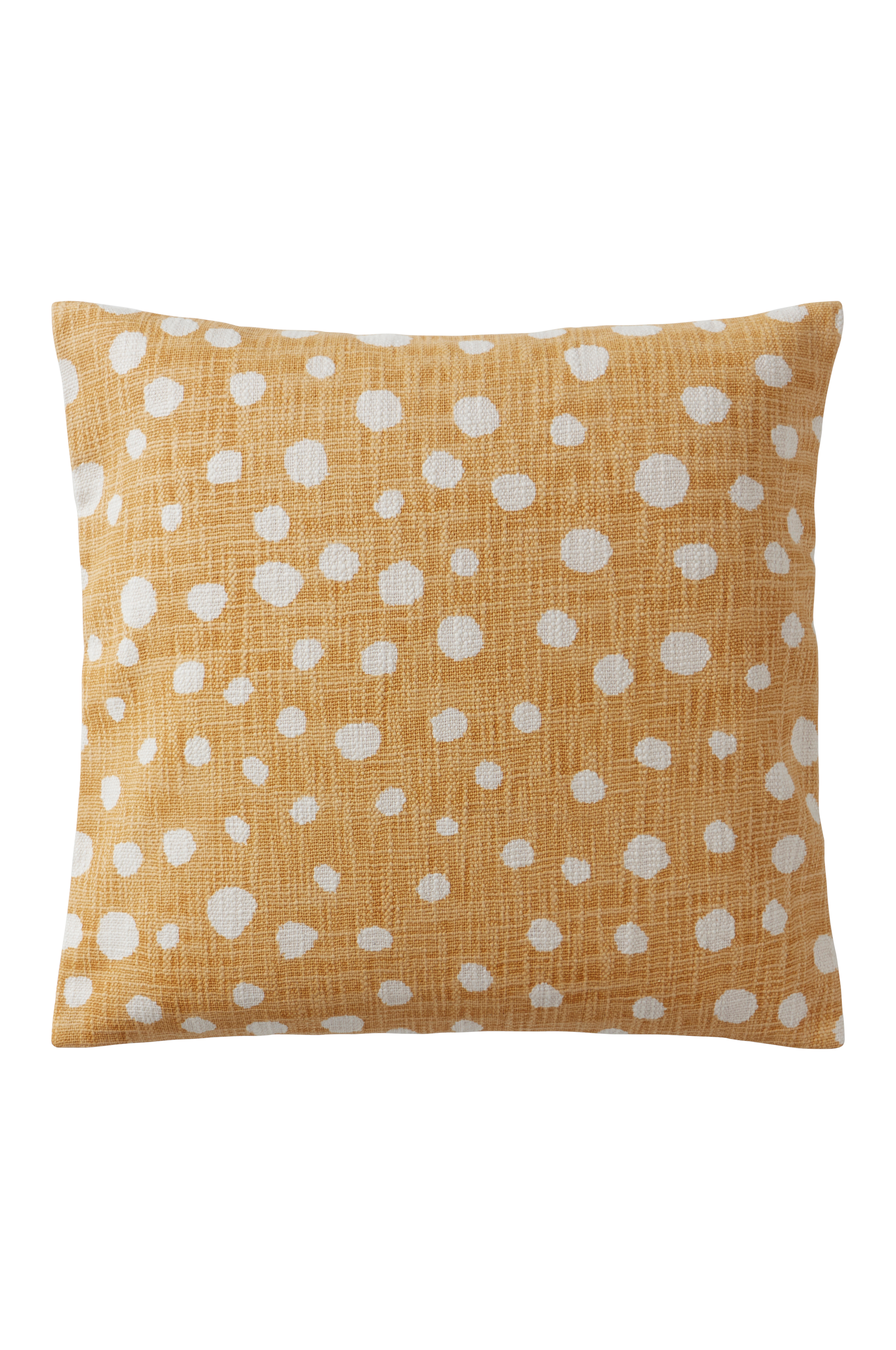 Tyynynpäällinen puuvillaa, 1/pakkaus. Tyynynpäällisen etupuoli paksuhkoa, eläväpintaista kangasta, jossa painettu pilkkukuvio. Luonnonvärinen, kevyesti meleerattu takaosa, jossa piilovetoketju. Etupuoli on vuorattu samalla kankaalla, kuin mitä on tyynynpäällisen takana.