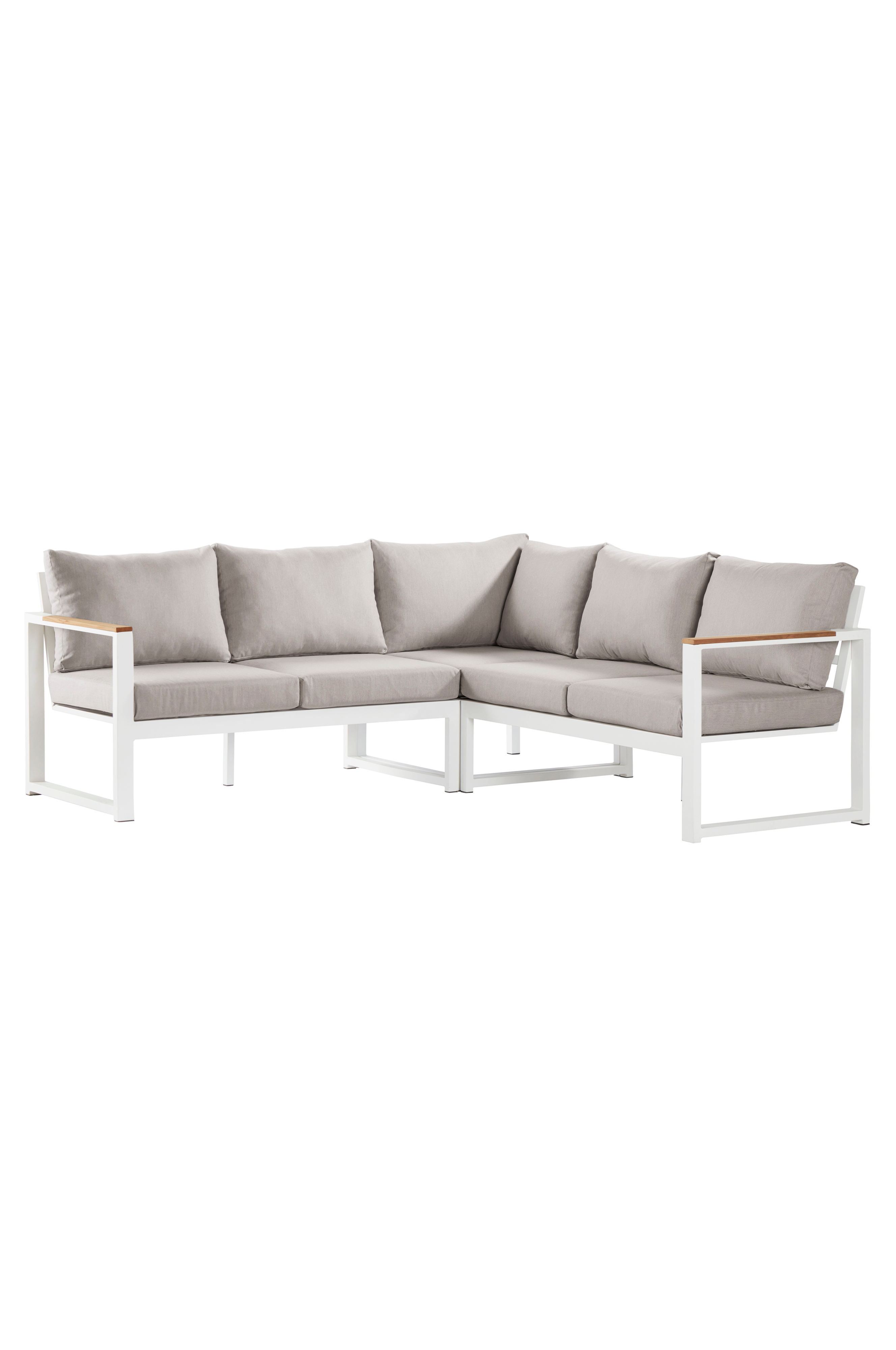 Kolmeosainen loungesohva, jonka käsinojat tiikkiä ja runko jauhemaalattua alumiinia. Miellyttävät pehmusteet ja mukavat selkätyynyt. Ryhmä koostuu kolmesta osasta, jotka voit sijoittaa mielesi mukaan joko yhteen tai erikseen. Alumiini on käytännöllinen, kevyt ja ruostumaton materiaali. Kalusteen voi jättää ulos. Osittain koottava.