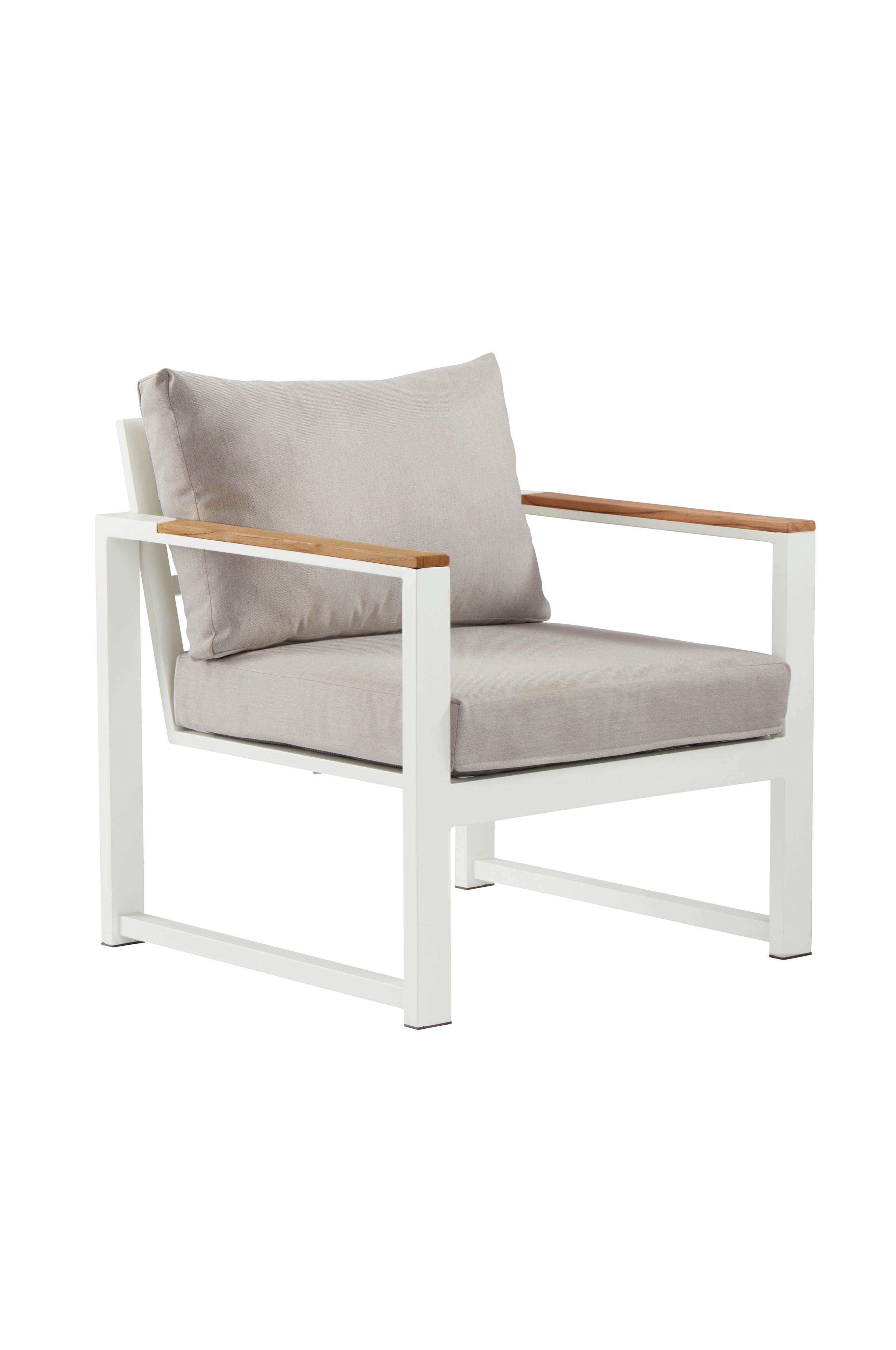 Nojatuoli, jonka käsinojat tiikkiä ja runko jauhemaalattua alumiinia. Miellyttävät pehmusteet ja mukava selkänoja. Alumiini on käytännöllinen, kevyt ja ruostumaton materiaali. Kalusteen voi jättää ulos. Osittain koottava.