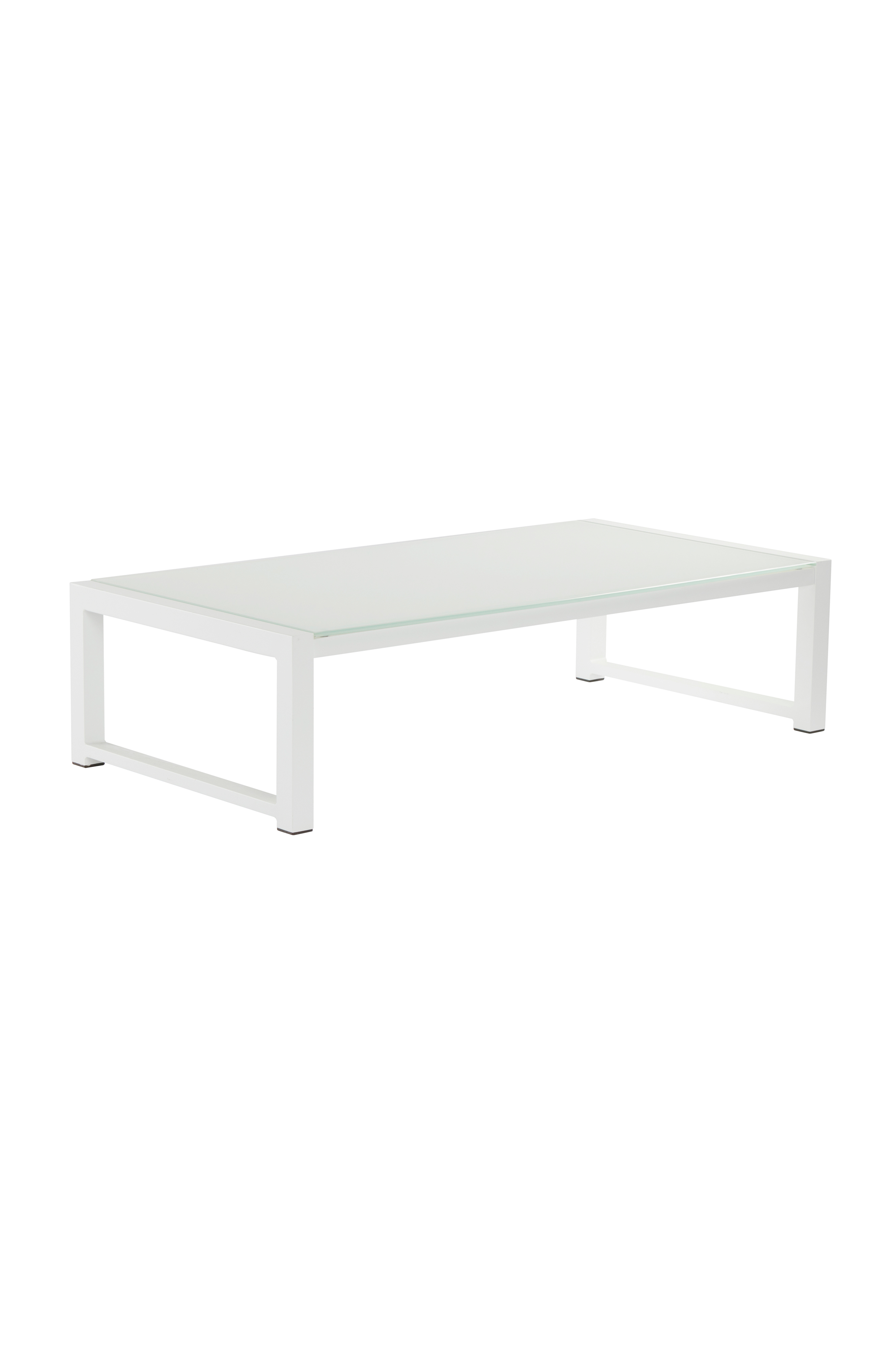 Suorakulmainen sohvapöytä, jonka pöytälevy lasia ja jalusta jauhemaalattua alumiinia. Alumiini on käytännöllinen, kevyt ja ruostumaton materiaali. Kalusteen voi jättää ulos. Osittain koottava.
