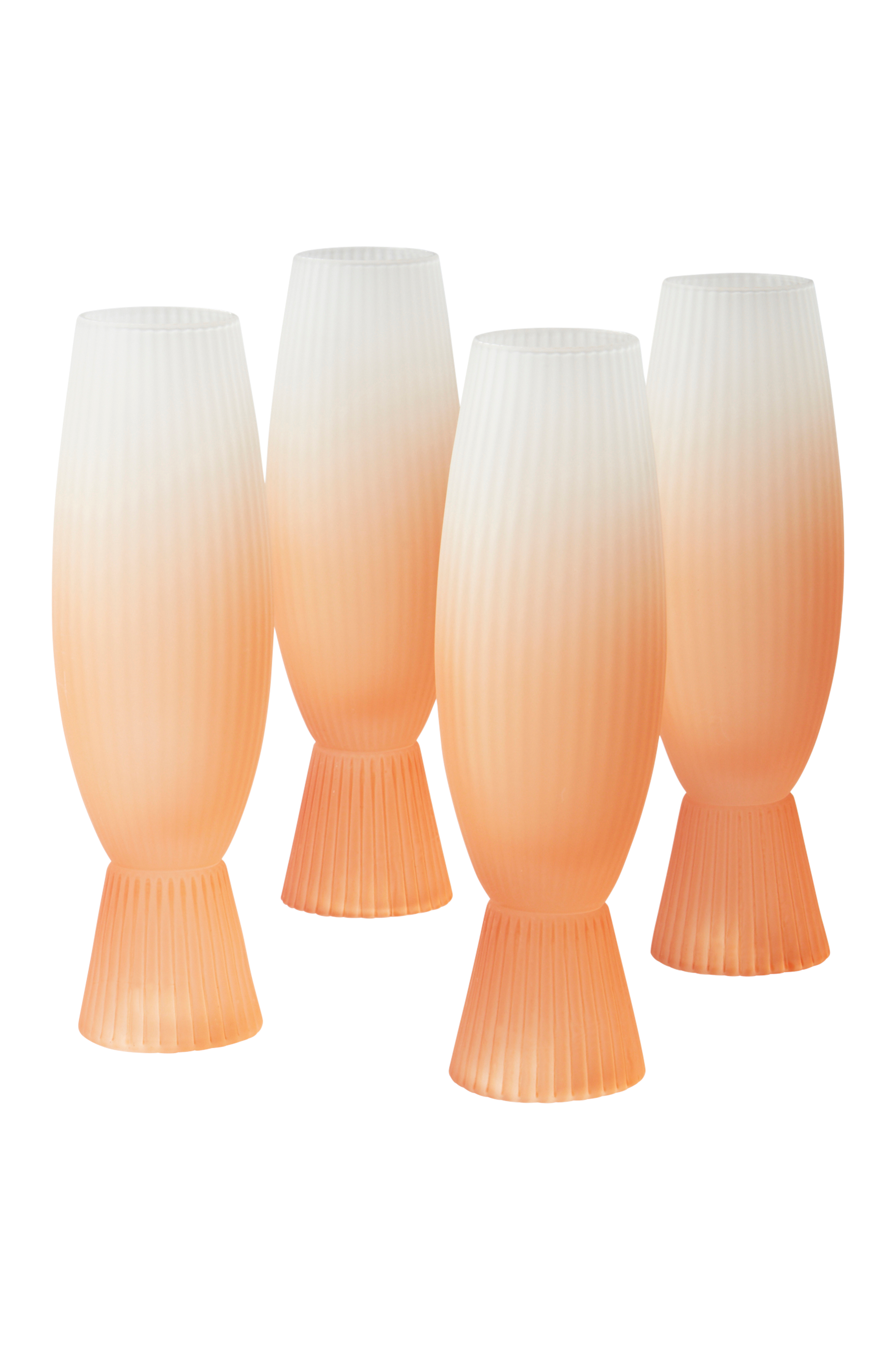 Samppanjalasit, 4/pakkaus. Erityinen muotoilu ja raikkaat värit tekevät PEACH-lasisarjasta kesäisen ja raikkaan. Laseissa on ulkosivulla hieno mattapintainen, huurteisen näköinen reliefiraidoitus, kun taas sisäpinta on sileä ja kiiltävä. PEACH-samppanjalasit sopivat hyvin myös monille muille juomille, kuten virkistäville kylmille hedelmäjuomille tai raikkaalle vedelle. Kauniiden lasien muotoilussa voi olla pieniä eroja, mikä korostaa käsinpuhallettua tunnetta.