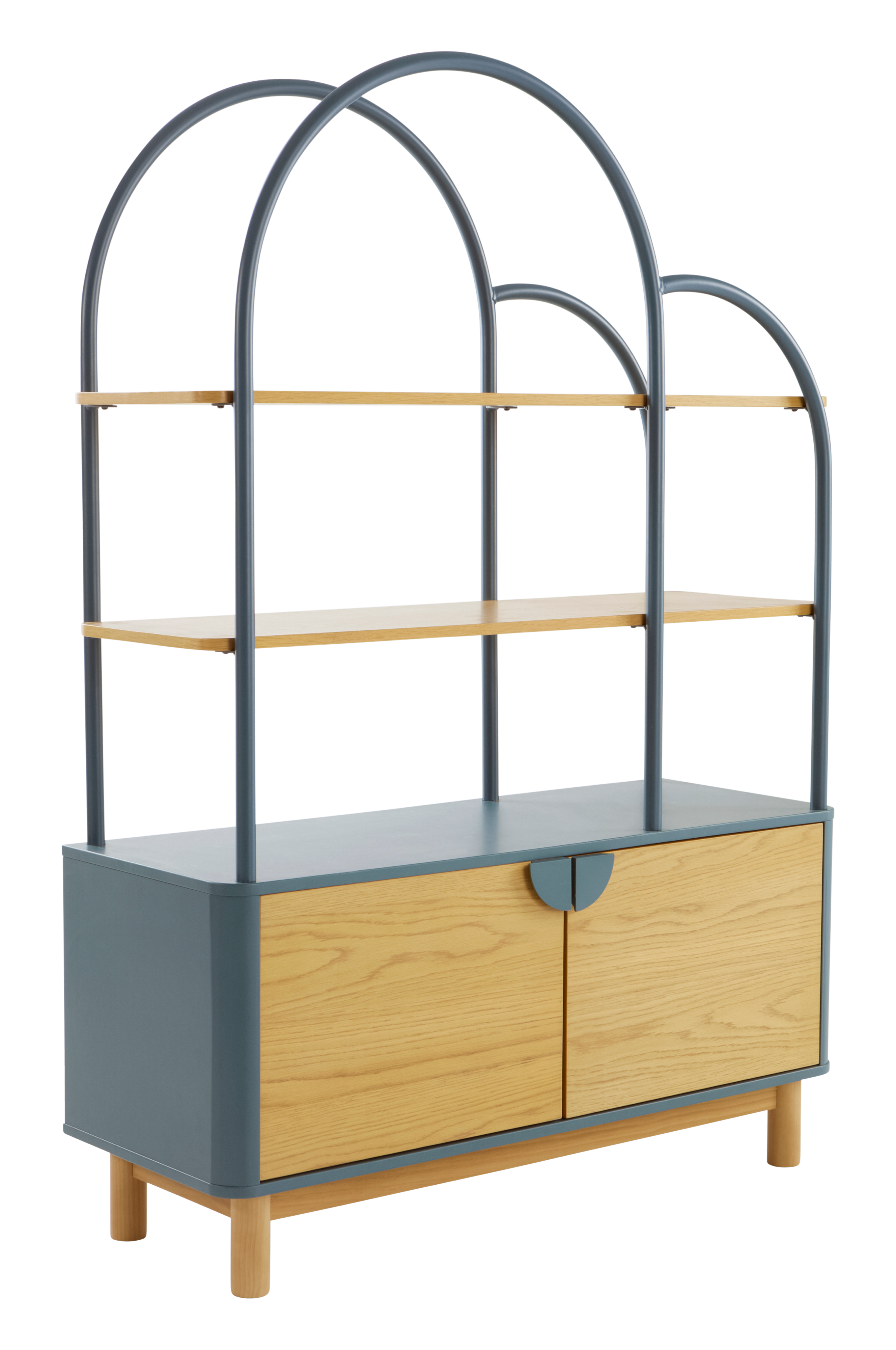 PENNY-hyllyssä yhdistyvät käytännöllisyys ja tyyli lastenhuoneeseen. Siinä on MDF-levyhyllyt tammiviilulla ja jauhemaalattu teräsrunko. Kaareva muotoilu ja avoimet hyllyt sopivat erinomaisesti leluille ja kirjoille, ja niiden alla on huomaamaton säilytystila.