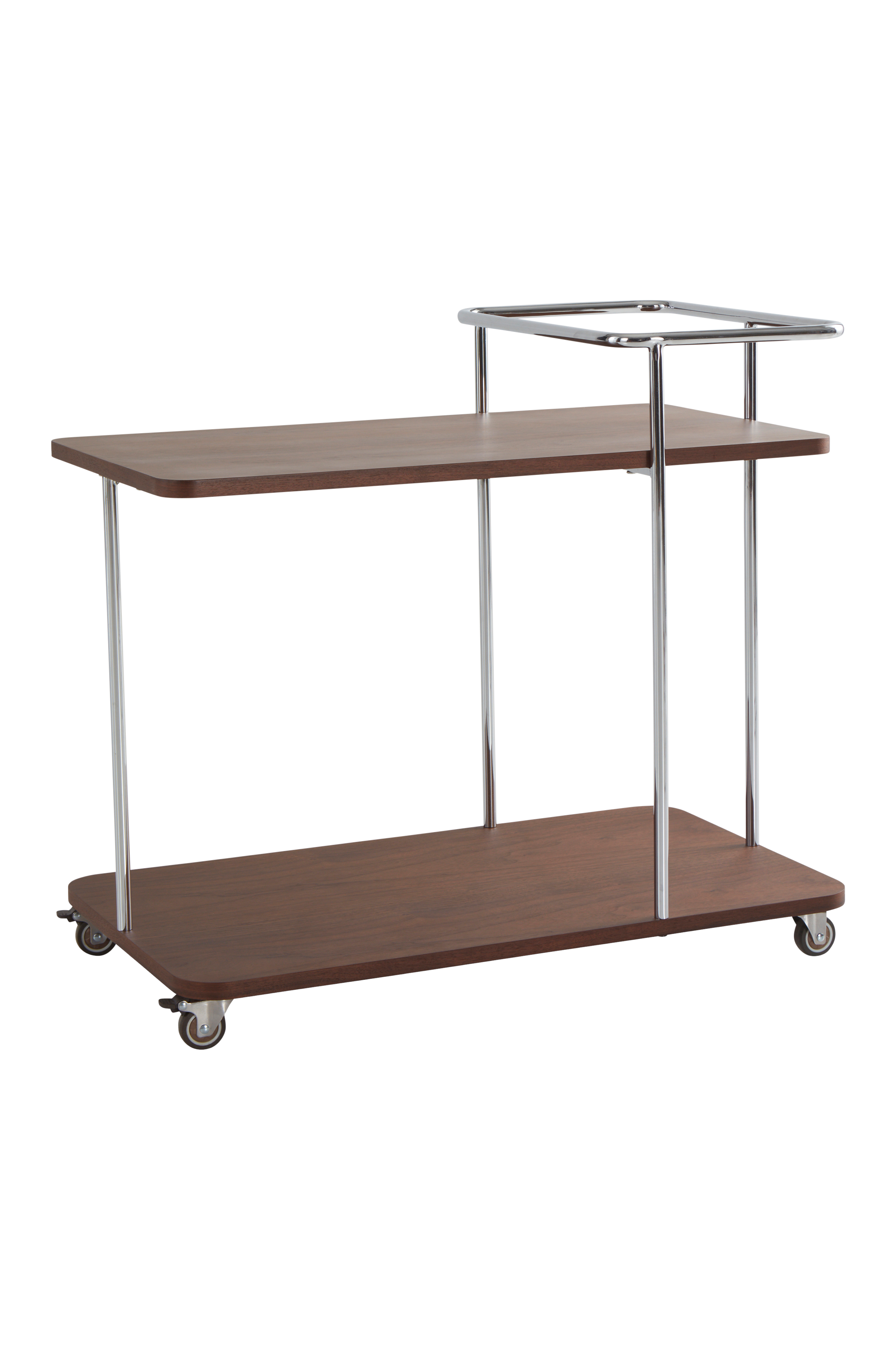 PINGLE on saksanpähkinäviilusta valmistettu rullaava tarjoiluvaunu. Muunna olohuoneesi tai ruokailutilasi tämän tyylikkään rullattavan tarjoilukärryn avulla. Se on valmistettu FSC-sertifioidusta MDF-levystä, jossa on runsaasti pähkinäviilua, ja siinä on tukeva rautainen alusrunko, jossa on tyylikäs kromattu viimeistely. Sen muotoilussa on neljä pehmeästi liukuvaa pyörää, joista kahdessa on jarrut vakauden takaamiseksi, mikä takaa vaivattoman liikkuvuuden. Hyllyjen välinen etäisyys on 49,3 cm. Yläosan metallirunko lisää 11 cm:n suojareunan ja 6,5 cm:n korkuiset pyörät, jotka yhdistävät toiminnallisuuden ja tyylin.