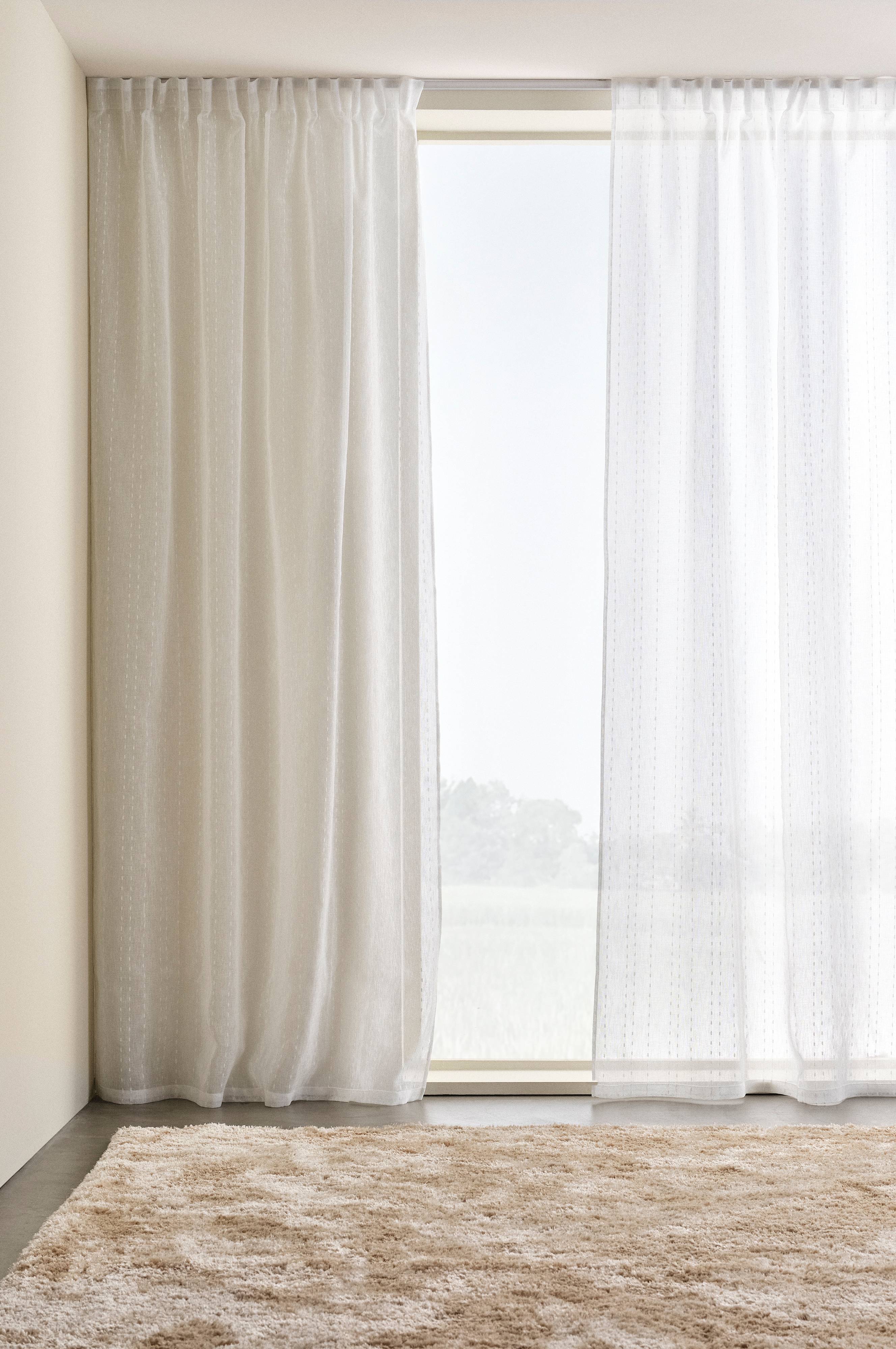 Kaksi sivuverhoa ohutta polyesteriä. Verhoissa on koristeompeleita ja päälleommeltu monitoiminauha. Kangas on aavistuksen läpikuultavaa, ja verhot läpäisevät kauniisti valoa sekä antavat jonkin verran näkösuojaa ikkunan eteen vedettyinä. Verhot voidaan ripustaa sormikoukkujen, kujan tai piilolenkkien avulla. Alareunassa on overlock-sauma.