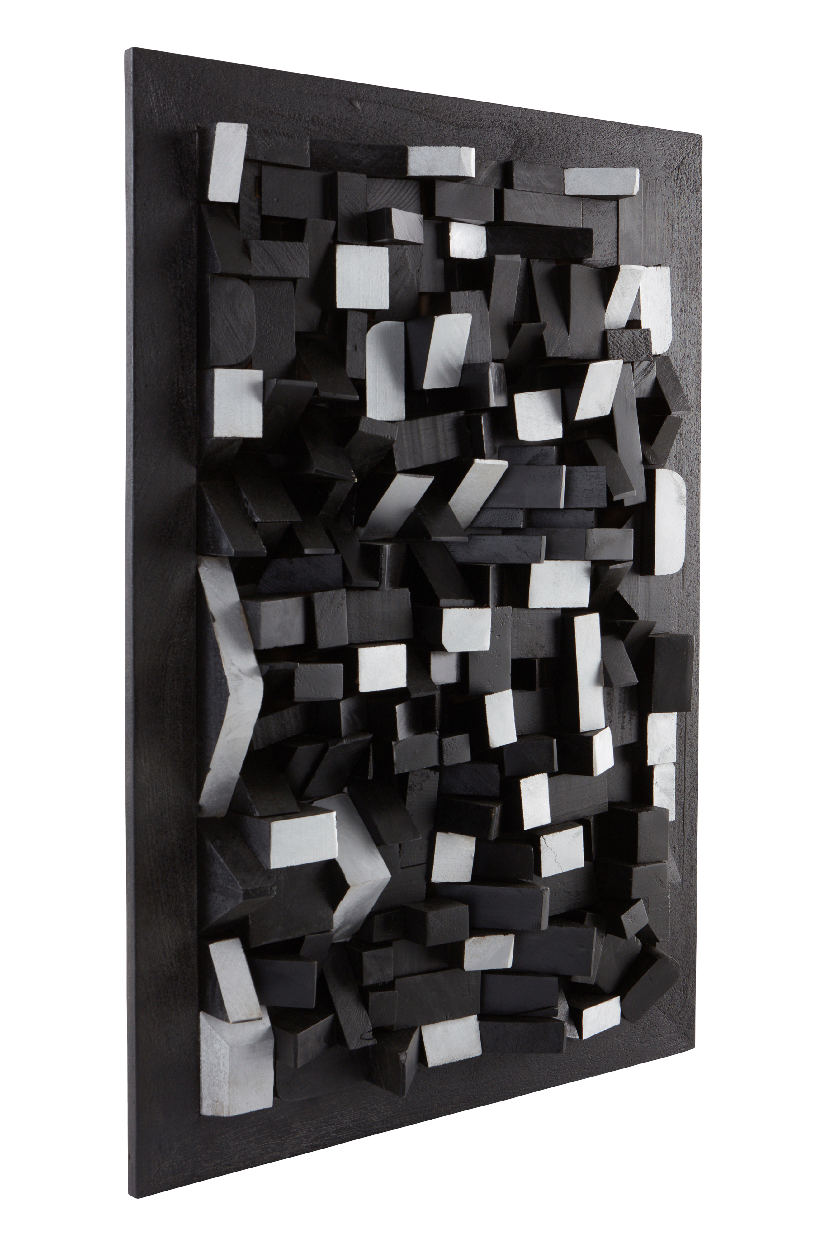 Iso käsintehty seinäkoriste massiivista mangopuuta. Kolmiulotteisen vaikutelman luova geometrinen kuvio on luotu mustista puupalikoista. Osassa palikoita on hopeanvärinen etuosa, mikä vahvistaa kolmiulotteista vaikutelmaa. Näkyvillä olevat puunsyyt antavat kuviolle syvyyttä. Taulussa on rouhea tuntu, ja jokainen taulu on ainutlaatuinen yhdistelmä hienoa käsityötä ja aitoa puuta luonnollisine variaatioineen. Kolme ripustuslenkkiä takana.