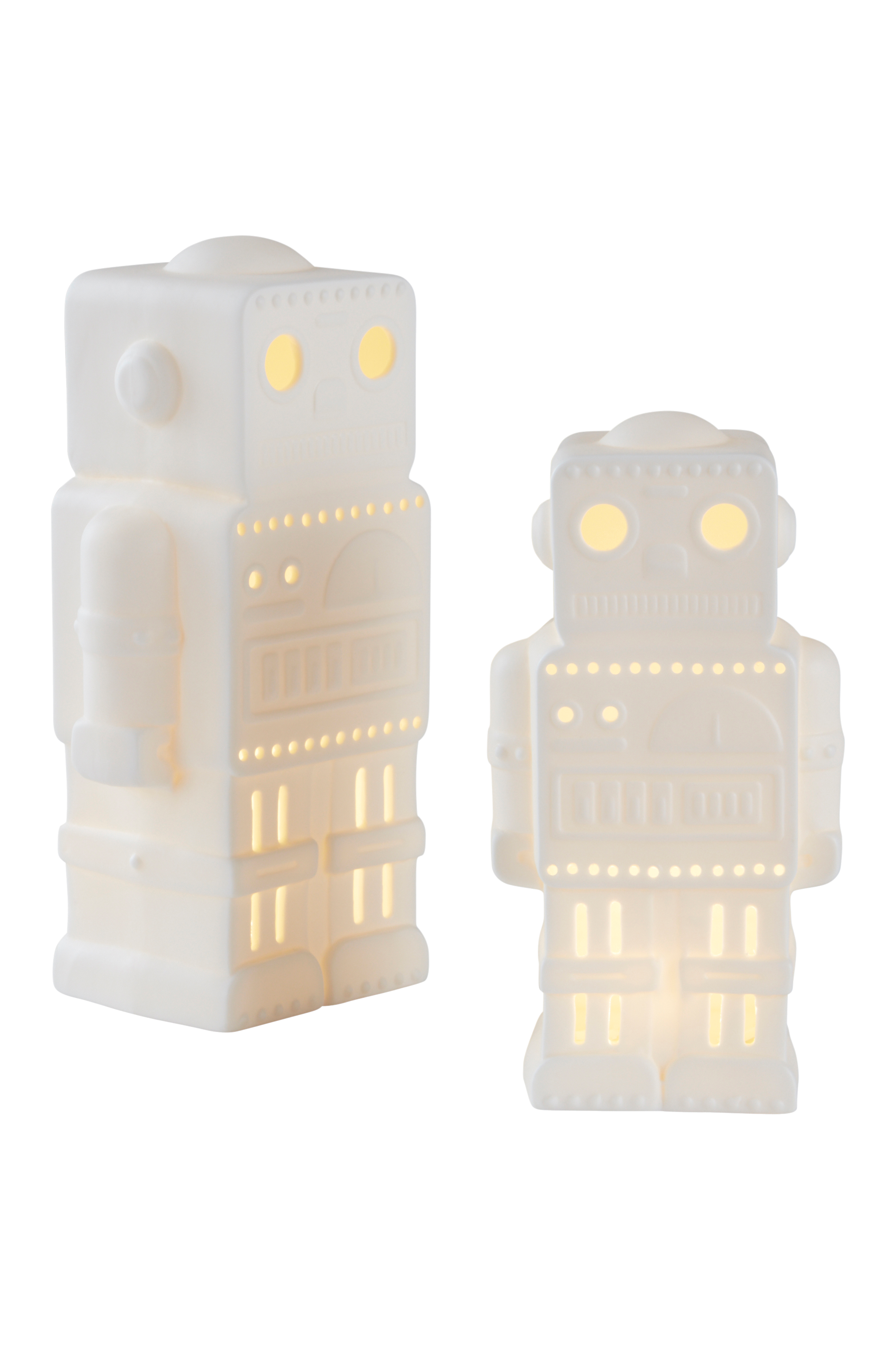 Posliiniset yövalot, joissa LED-lamppu. 2/pakkaus. Molemmat lamput ovat pienen robotin muotoiset ja hieman läpikuultavat, joten ne levittävät pehmeän ja tunnelmallisen valon. Sytytä valaisimet yöllä tuomaan lempeää valoa lapsille, jotka tuntevat olonsa turvallisemmaksi kevyesti valaistussa huoneessa. Paristokäyttöinen. Valaisimen pohjassa on pieni virtakatkaisin.