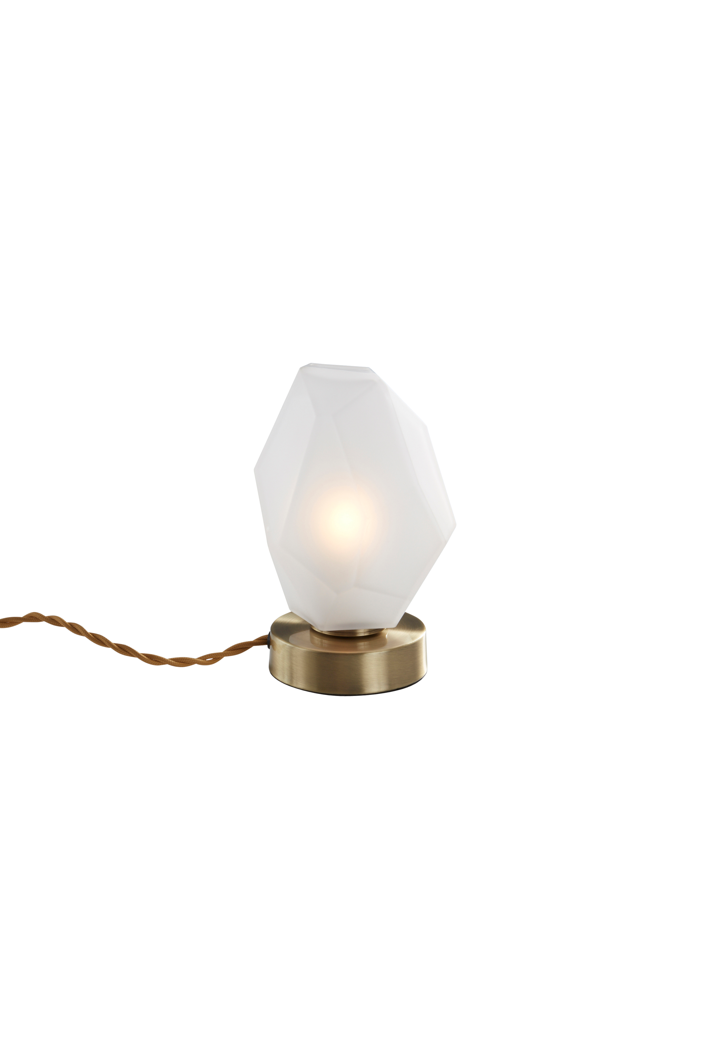 Pöytävalaisin, jossa antiikkimessinginvärinen jalka ja kupu huurrelasia. Tyylikäs valaisin on erittäin helppo sijoittaa. Kangaspäällysteinen johto, johdon pituus 2 m.