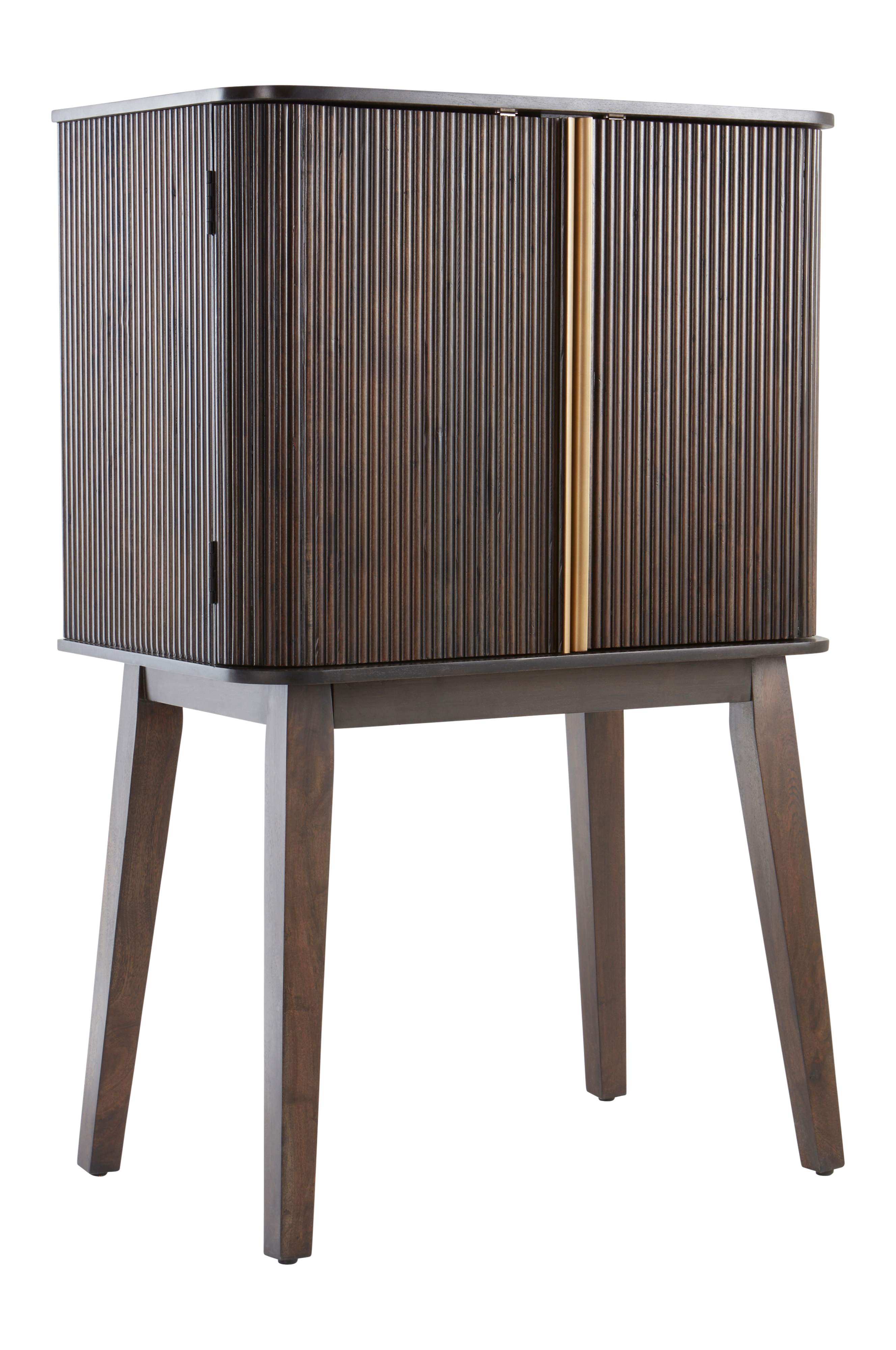 Baarikaappi on miellyttävän retrohenkinen aina estetiikasta muotoiluun. Uurrettu profiili luo kaapille ylellisen ilmeen. Syvät, pyöristetyt ovet sisältävät käytännöllisiä hyllyjä ja lokeroita, joissa voit säilyttää. Myös sisäpuolella on messinginvärisiä metalliyksityiskohtia. Levenevät jalat vahvistavat miellyttävää retrotunnelmaa. Osittain koottava. Kokoamisohje mukana.