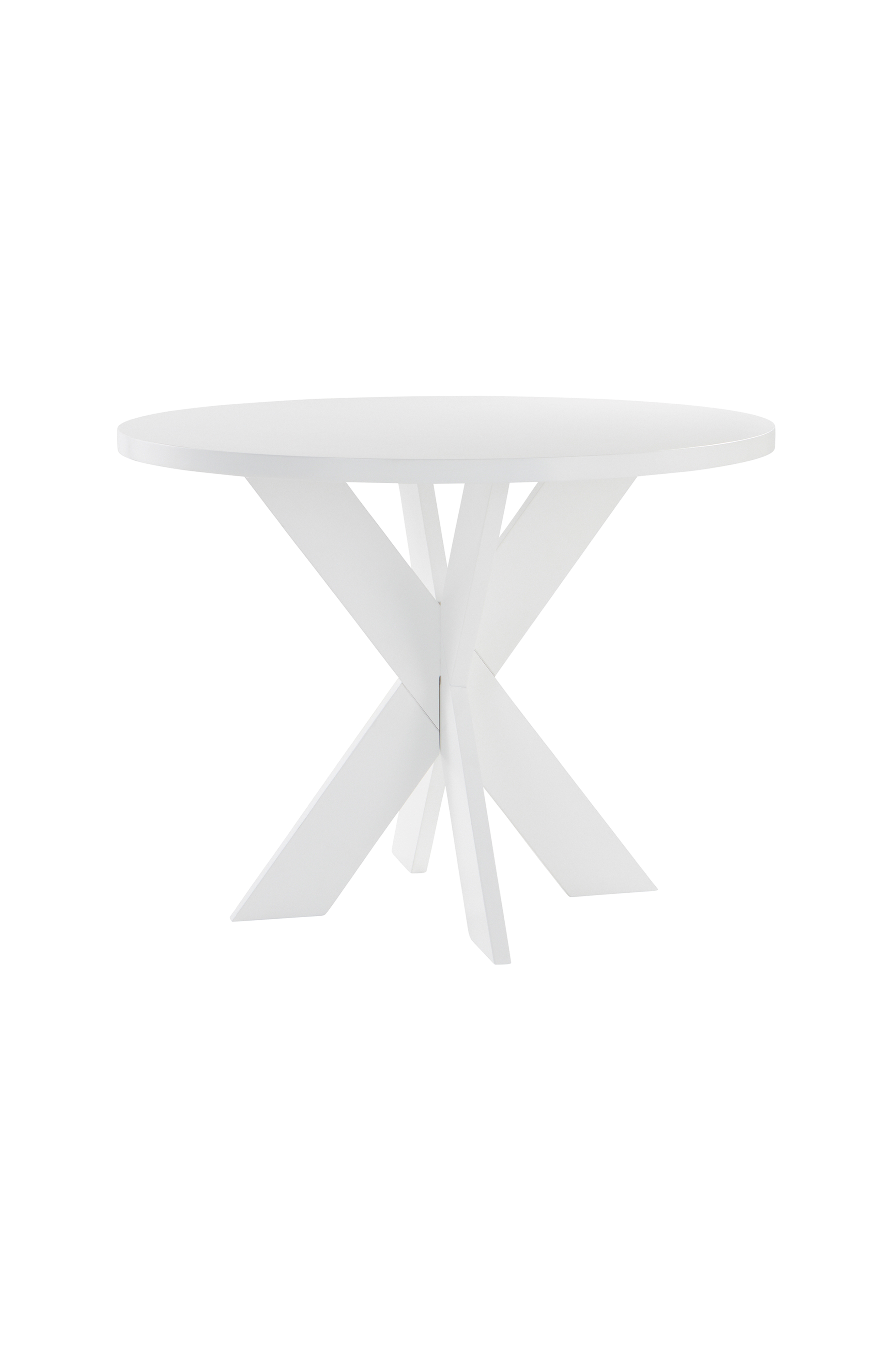 Pyöreä pöytä MDF-levyä. Tyylikkäässä pöydässä on hienoa tammiviilua sekä mattapintainen, vesipohjainen lakka pinnassa. Vakaa ristikkäinen alusta on sekä kaunis että käytännöllinen ja jättää paljon tilaa jaloille. Osittain koottava. Kokoamisohjeet mukana.