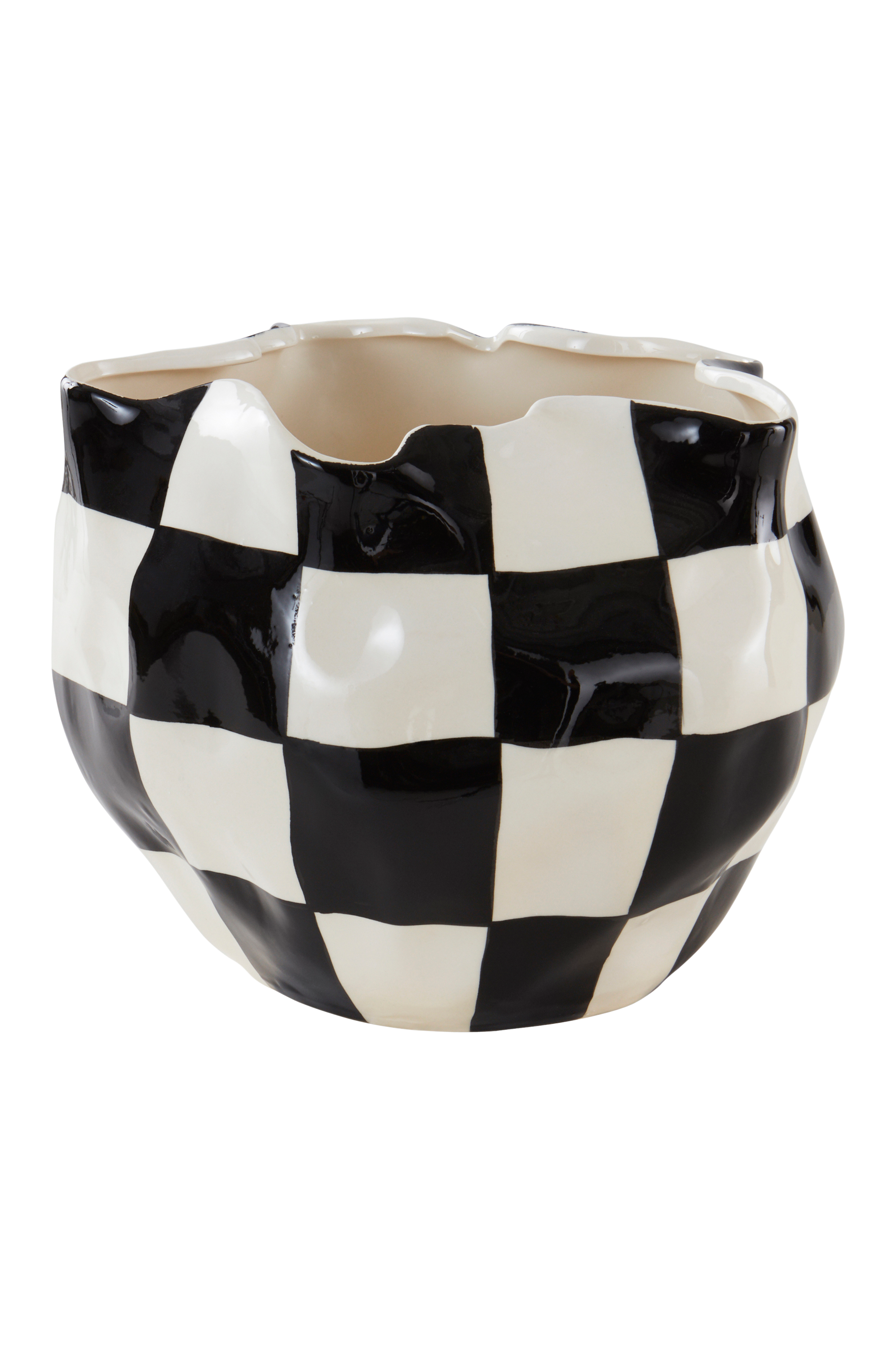 Käsintehty keramiikkaruukku, jossa aaltomainen epäsymmetrinen muoto ja musta-valkoinen shakkiruutukuvio. Kuvio ja muoto muodostavat miellyttävän kontrastin. Ruukussa on kiiltävä lasite, myös sisäpinta on lasitettu. Hieno käsityö tekee jokaisesta ruukusta ainutlaatuisen. Huomaa, että keramiikka voi päästää kosteutta läpi.