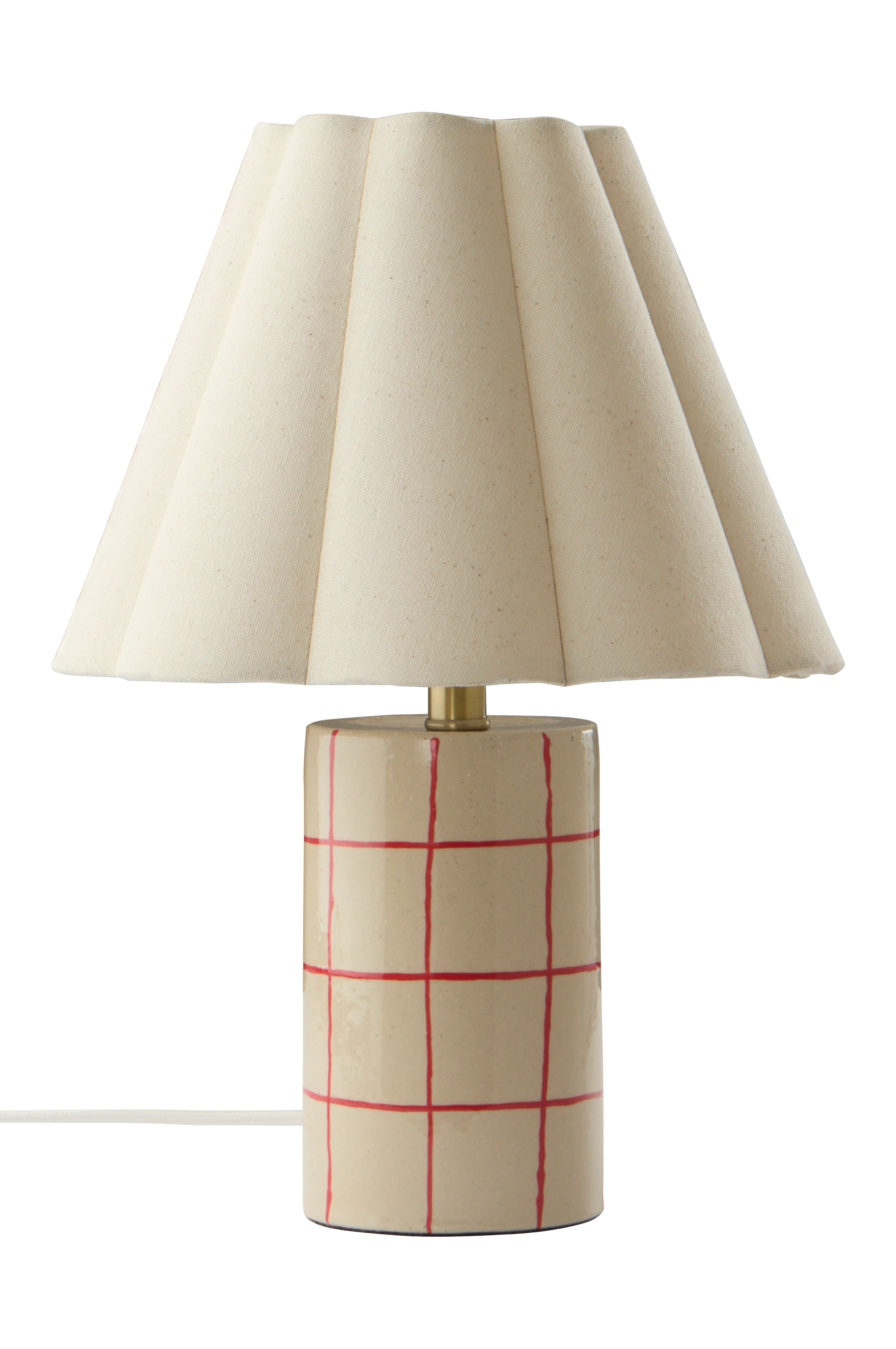 RUTHIE-pöytävalaisimessa on luonnonpellavasta valmistettu varjostin ja keraaminen jalusta, jossa on punaisia viivoja. Valaisimessa on valkoinen tekstiilikaapeli, jossa on on/off-kytkin, joten se sopii moderniin sisustukseen.