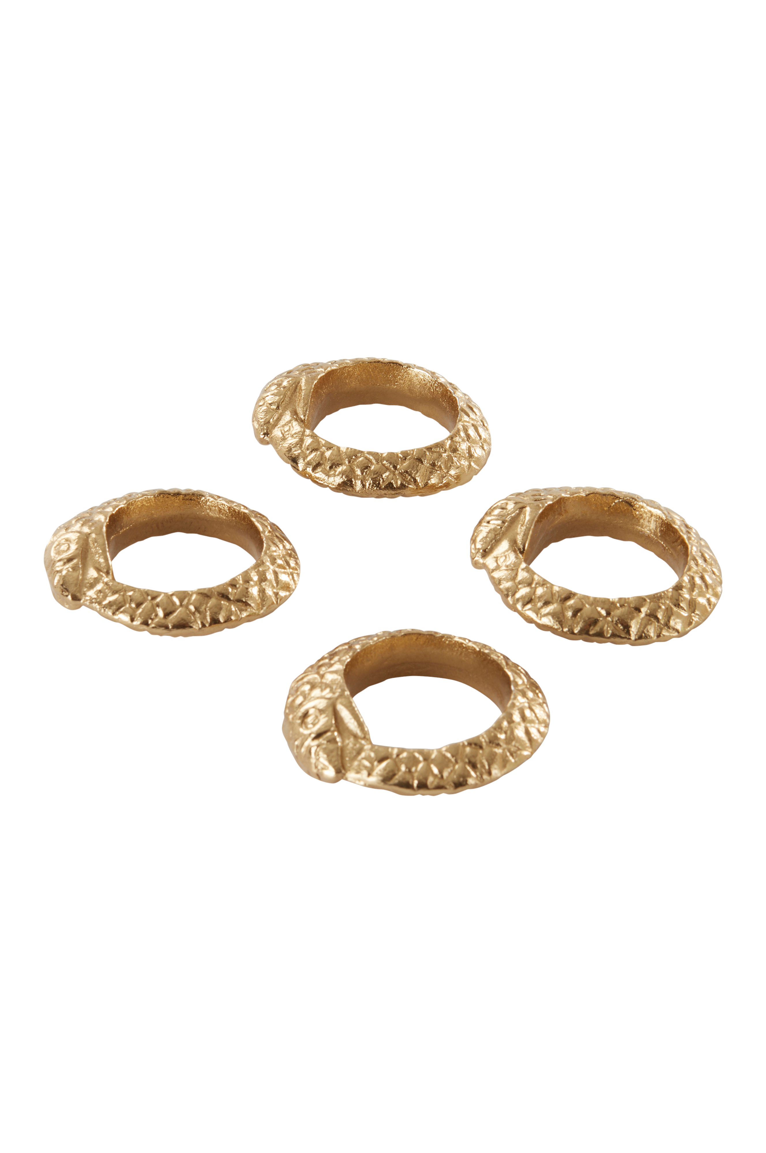 Alumiiniset lautasliinarenkaat, 4/pakkaus. Kerälle käpertyneen käärmeen muotoiset lautasliinarenkaat, joissa on kaunis pintakuvio. Messinginvärinen viimeistely tekee lautasliinarenkaista erityisen tyylikkäät.