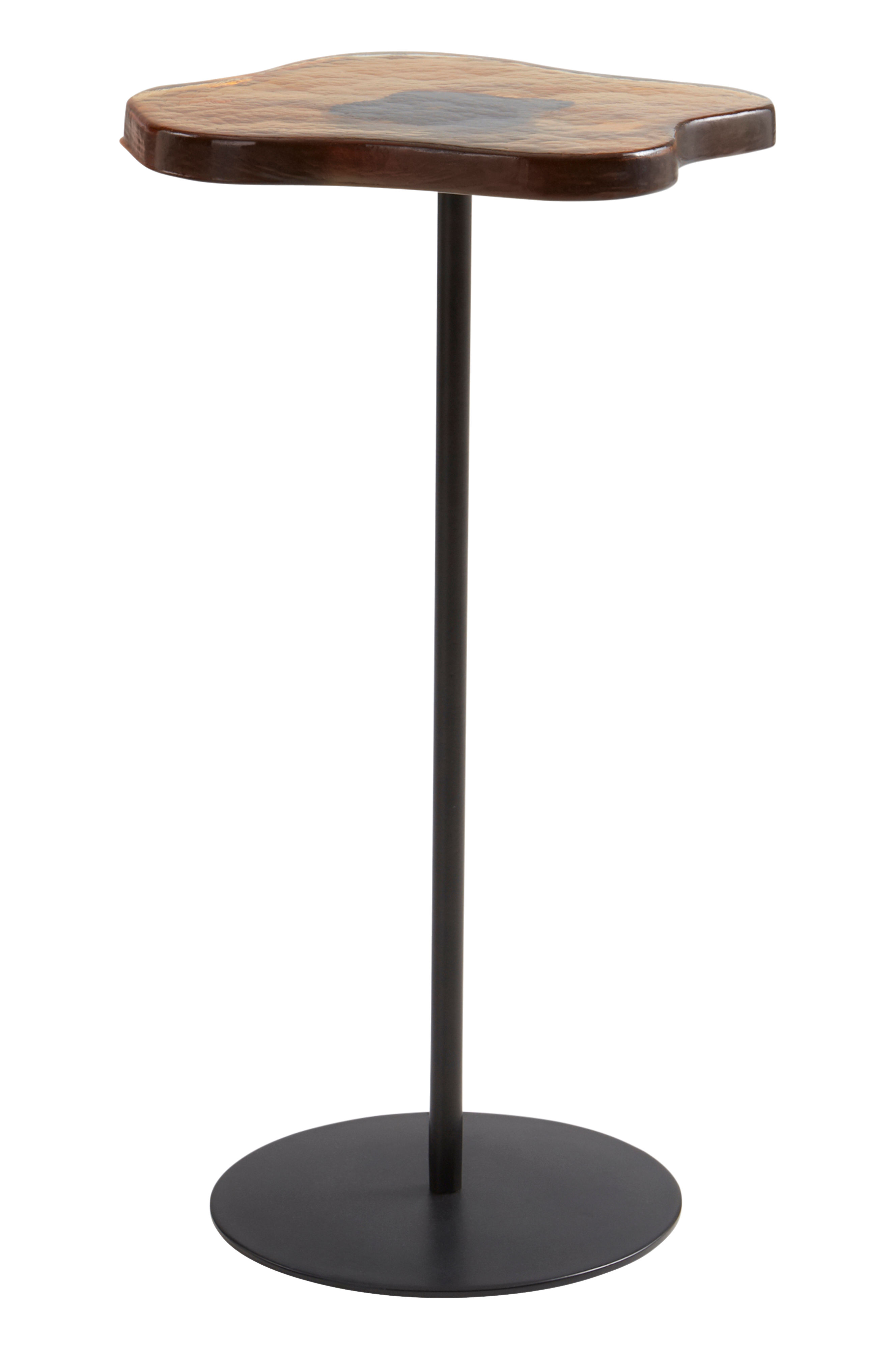SAKSUN on siro, tyylikäs sivupöytä, jossa on rautainen pilarijalka ja sen päällä kaunis, hieman läpikuultava pöytälevy meripihkan väristä lasia. Pöytälevyssä on aaltoileva ja epäsäännöllinen muoto, taianomainen väri ja kevyt struktuuripinta, joka saa värin hohtamaan. Jalassa on jauhemaalattu pinta.