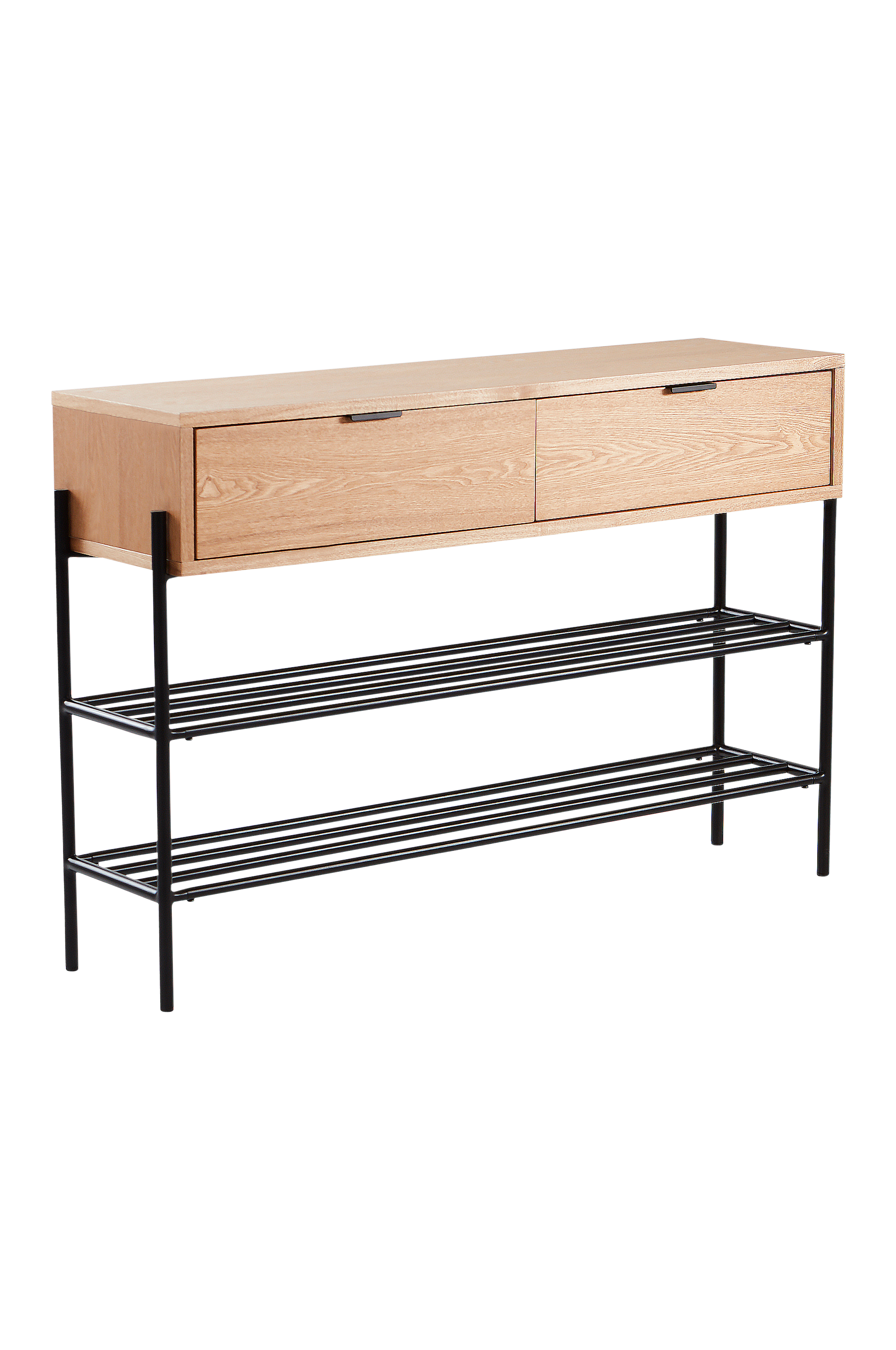 Eteiskaluste saarniviilua. Tilaa säästävässä kalusteessa yhdistyvät lipasto ja kenkähylly. Jalat ja kaksi kenkähyllyä mattapintaista jauhemaalattua terästä. Yläosan laatikosto MDF-levyä ja saarniviilua. Kummassakin laatikossa on huomaamaton aukkovedin. Laatikot on helppo avata ilman ulostyöntyviä nuppeja. Hyödyllinen ominaisuus pienessä eteisessä. Kätevässä, vähän tilaa vievässä ja tyylikkäässä eteiskalusteessa on laatikot avaimille, matkapuhelimille, käsineille ja muille välttämättömyyksille, ja kenkähyllyillä säilytät kengät siististi. Osittain koottava. Kokoamisohje mukana. Ruuvit mukana.