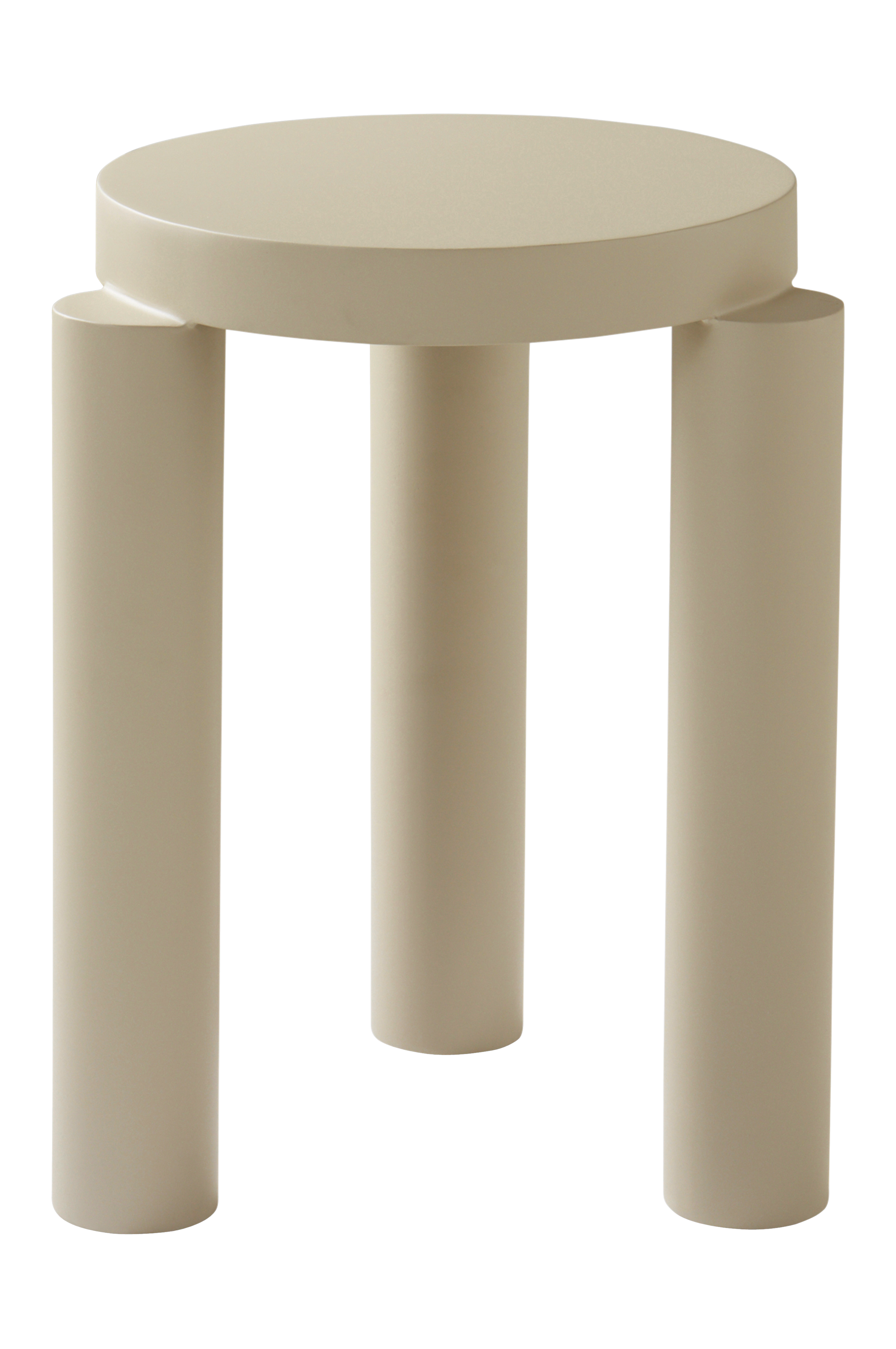 Pyöreä sivupöytä rautaa. Kolmijalkainen malli. Pyöreät jalat ovat puoliksi pöytälevyn ulkopuolella. Yksivärinen sivupöytä, jossa jauhemaalattu mattaväri.