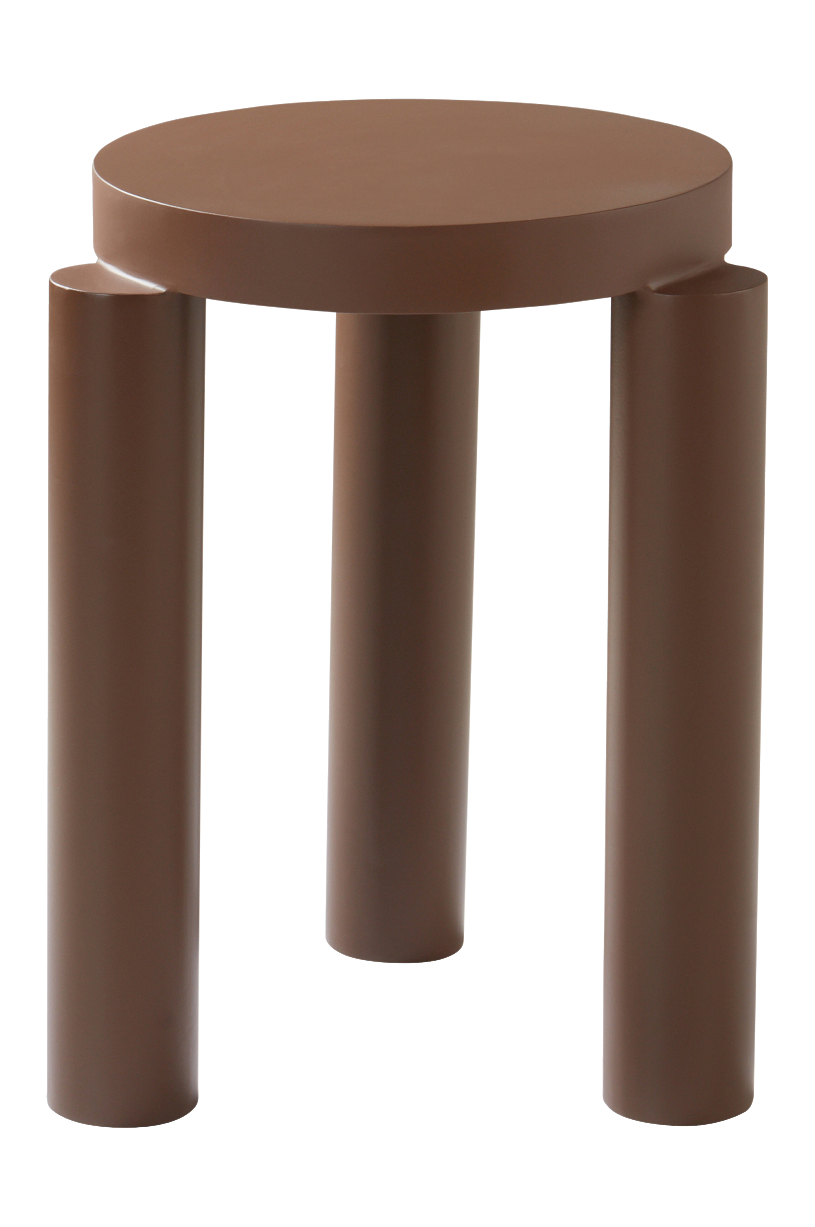Pyöreä sivupöytä rautaa. Kolmijalkainen malli. Pyöreät jalat ovat puoliksi pöytälevyn ulkopuolella. Yksivärinen sivupöytä, jossa jauhemaalattu mattaväri.