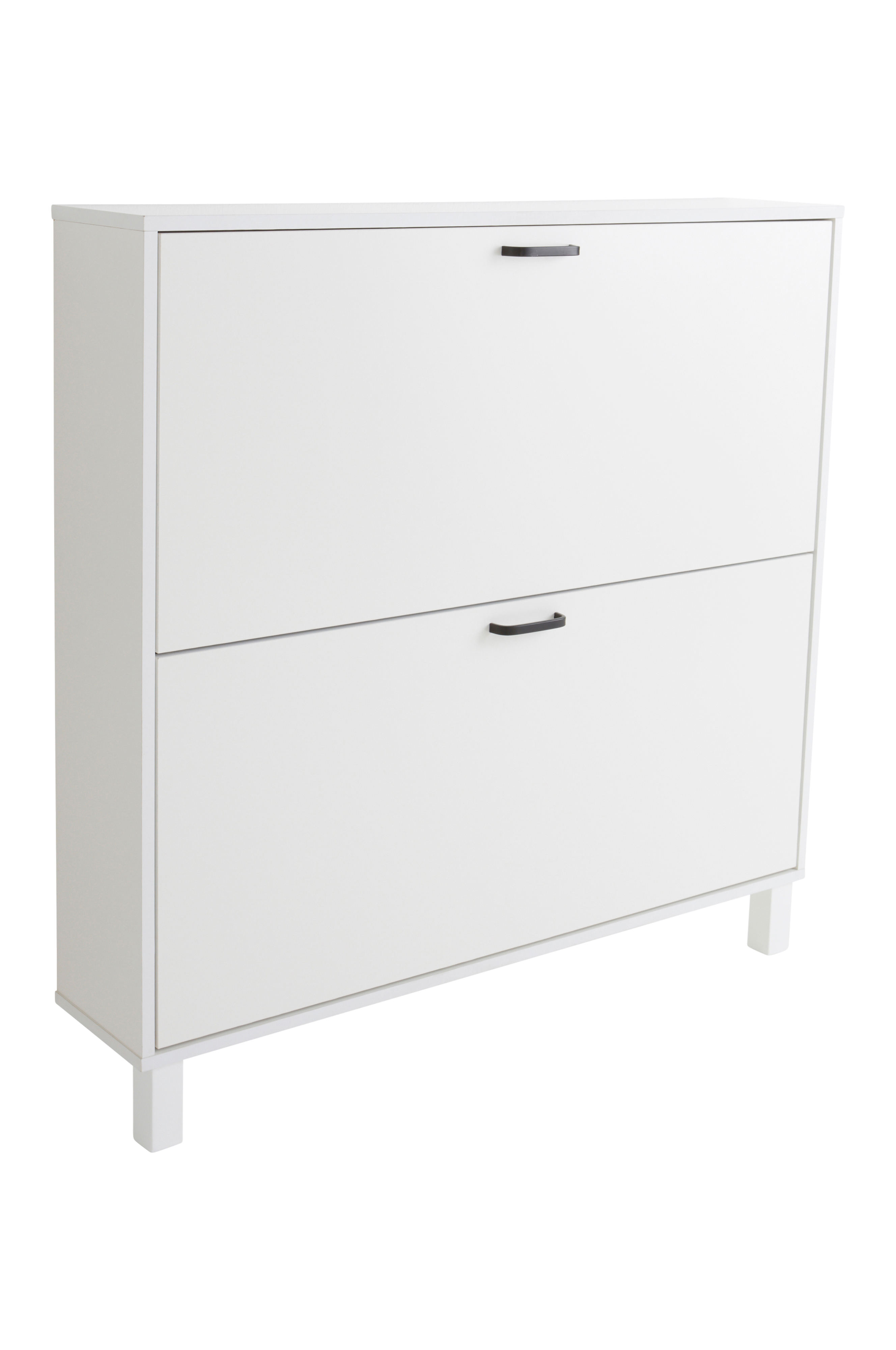 Kenkäkaappi FSC-merkitystä lastulevystä, jossa on melamiinipinnoite. Kaksi lokeroa kengille, jotka on helppo kaataa ulos yläreunasta. Maalatussa kaapissa on tiukka ja suora malli, jossa on neliskulmaiset jalat etureunassa, takareunassa ei ole jalkoja ja kaappi on kiinnitettävä seinään. Kahvat ovat pulverimaalattua metallia. Kuhunkin lokeroon mahtuu kolmesta neljään kenkäparia. Takareunassa metallikannattimet kaapin kiinnittämiseksi seinään.