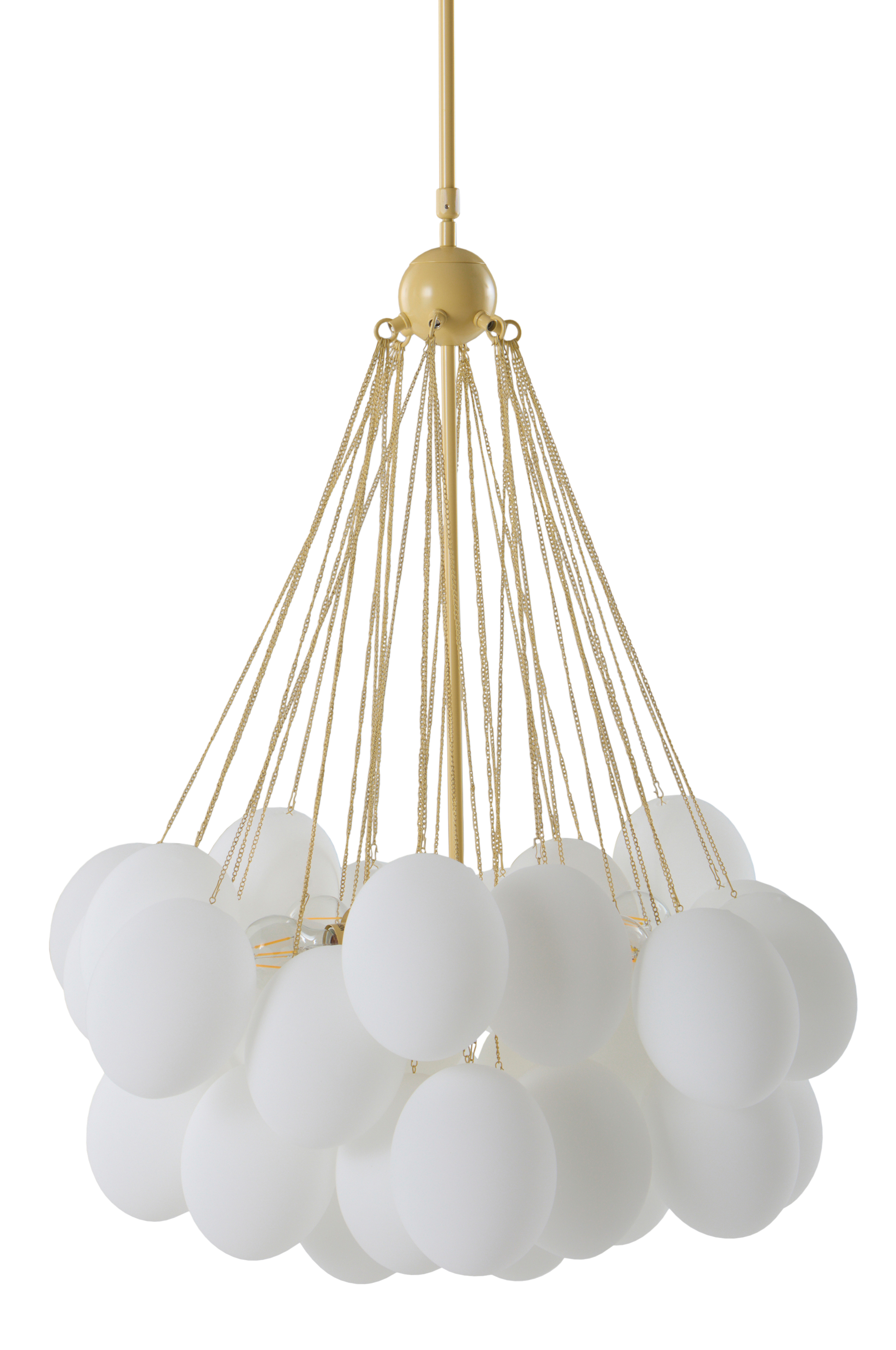 Kattovalaisin, jossa on 37 pyöreää opaalilasipalloa, kuudessa kupolissa on kynttilänpidike, joka saa lampun levittämään miellyttävää hehkua. Kupolit roikkuvat ihastuttavassa ryppäässä ja muodostavat upean ja jännittävän kattovalaisimen esimerkiksi ruokapöydän yläpuolelle. Runko ja kattokuppi on valmistettu raudasta.