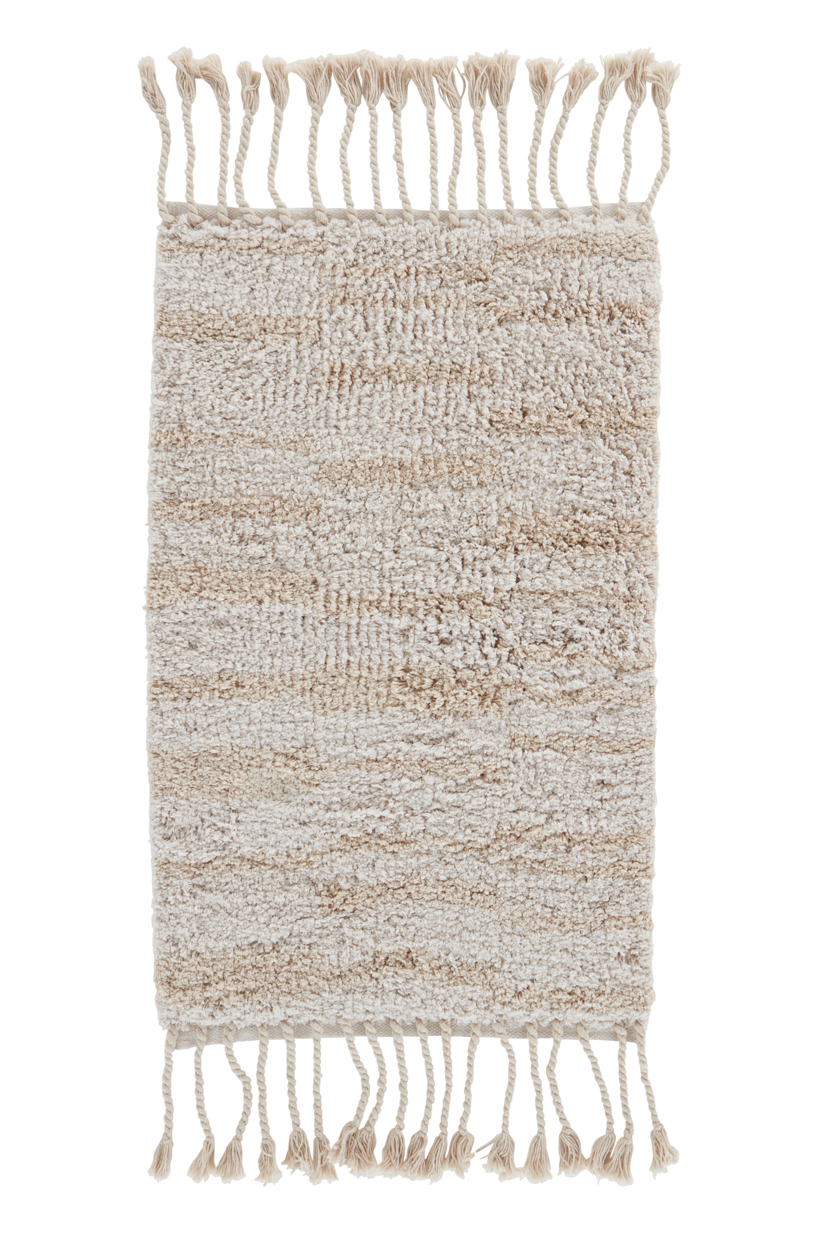 Käsinkudottu kylpyhuonematto pehmeää puuvilla. Pitkät, ihanat hapsut. Matossa on tyylikäs epäsäännöllinen raitakuvio. Jokainen käsinkudottu matto on ainutlaatuinen. Hapsujen pituus 20 cm. Nukan pituus 2-2,2 cm. Paksuus 2,2-2,4 cm. 3200-3400 g/m².