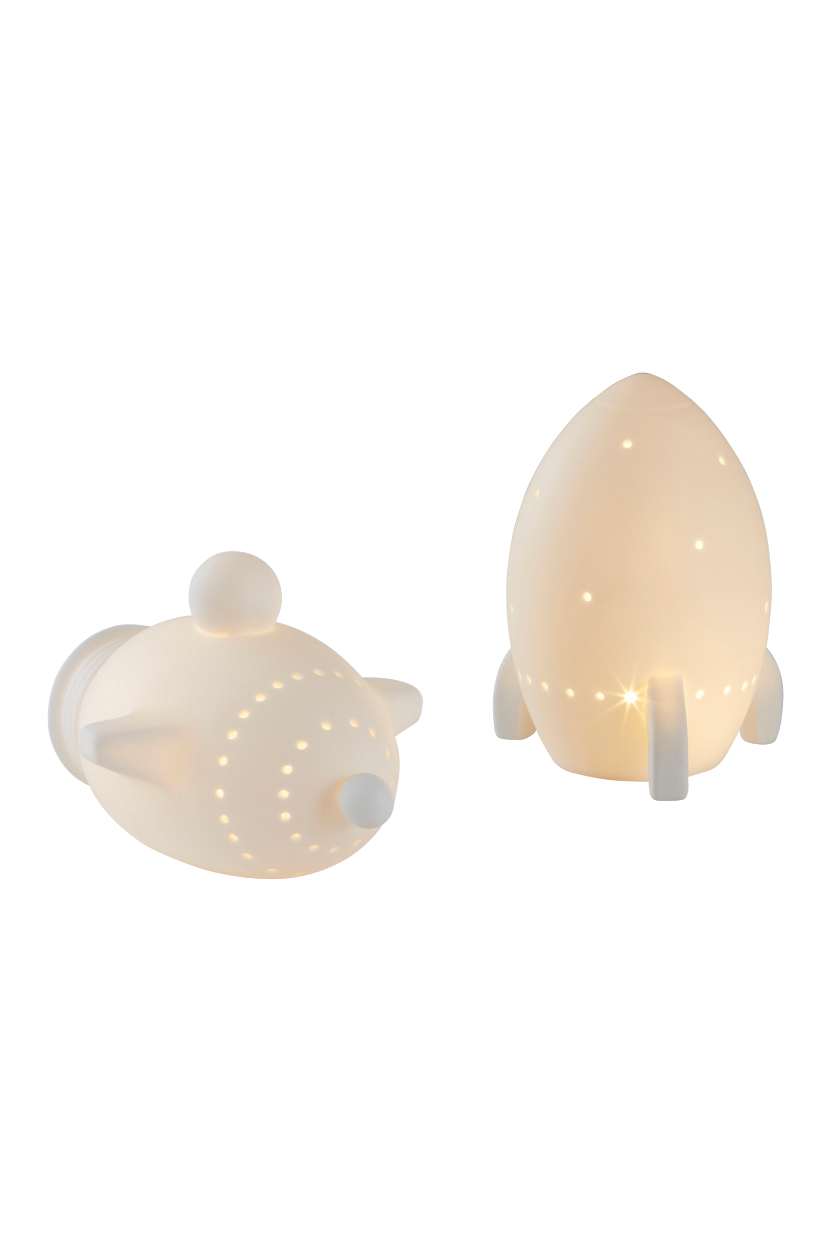 Posliiniset yövalot, joissa LED-lamppu. 2 kappaletta. Toinen lamppu on pienen raketin muotoinen ja toinen avaruusaluksen muotoinen. Molemmat ovat hieman läpikuultavat, joten ne levittävät pehmeän ja tunnelmallisen valon. Lamppu on yöllä lempeä LED-valo ja sopii lapsille, jotka tuntevat olonsa turvallisemmiksi, jos huoneessa on hieman valoa. Paristokäyttöinen. Valaisimen pohjassa on pieni virtakatkaisin.