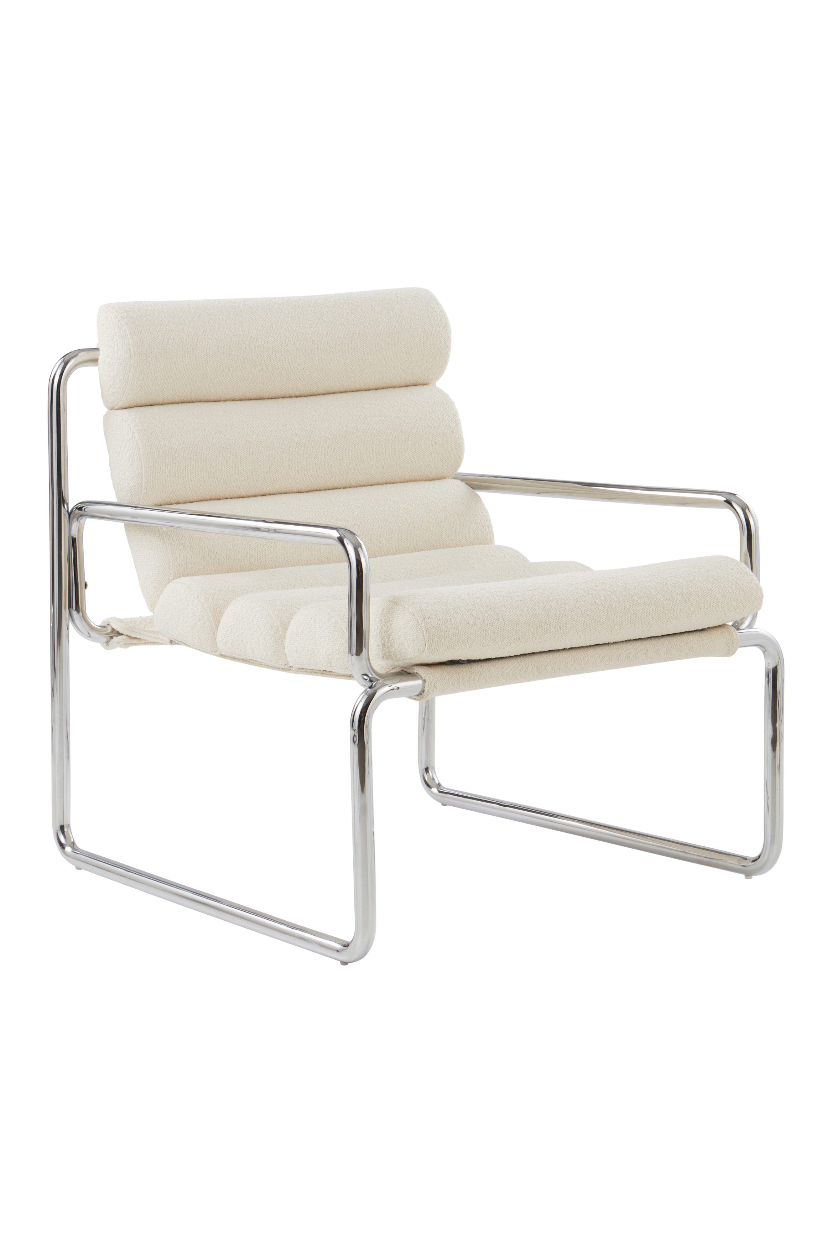 SINES-nojatuolissa yhdistyvät kromatut teräsputket ja sylinterimäinen istuin parhaaseen 80-luvun tyyliin. Lopputuloksena on mukava ja helposti sijoitettava nojatuoli, joka antaa huoneeseen ilmavan ja raikkaan tunnun. Vaalea kangas on kierrätysmateriaalista valmistettua pehmeää bukleeta, ja vaahtomuovipehmuste antaa käyttömukavuutta. Rautaputkissa on kromivärinen pinnoite.