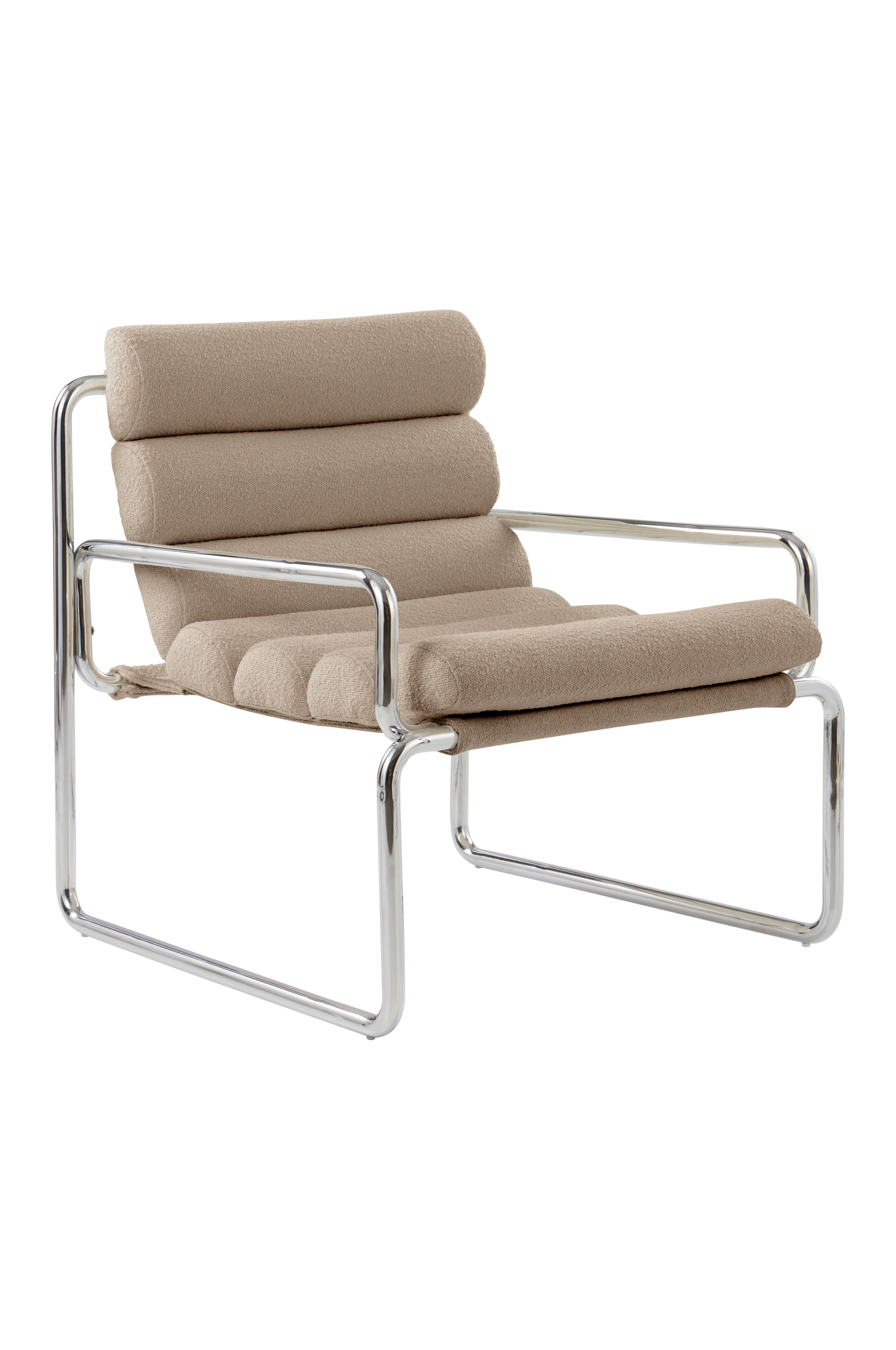 SINES-nojatuolissa yhdistyvät kromatut teräsputket ja sylinterimäinen istuin parhaaseen 80-luvun tyyliin. Lopputuloksena on mukava ja helposti sijoitettava nojatuoli, joka antaa huoneeseen ilmavan ja raikkaan tunnun. Vaalea kangas on kierrätysmateriaalista valmistettua pehmeää bukleeta, ja vaahtomuovipehmuste antaa käyttömukavuutta. Rautaputkissa on kromivärinen pinnoite.