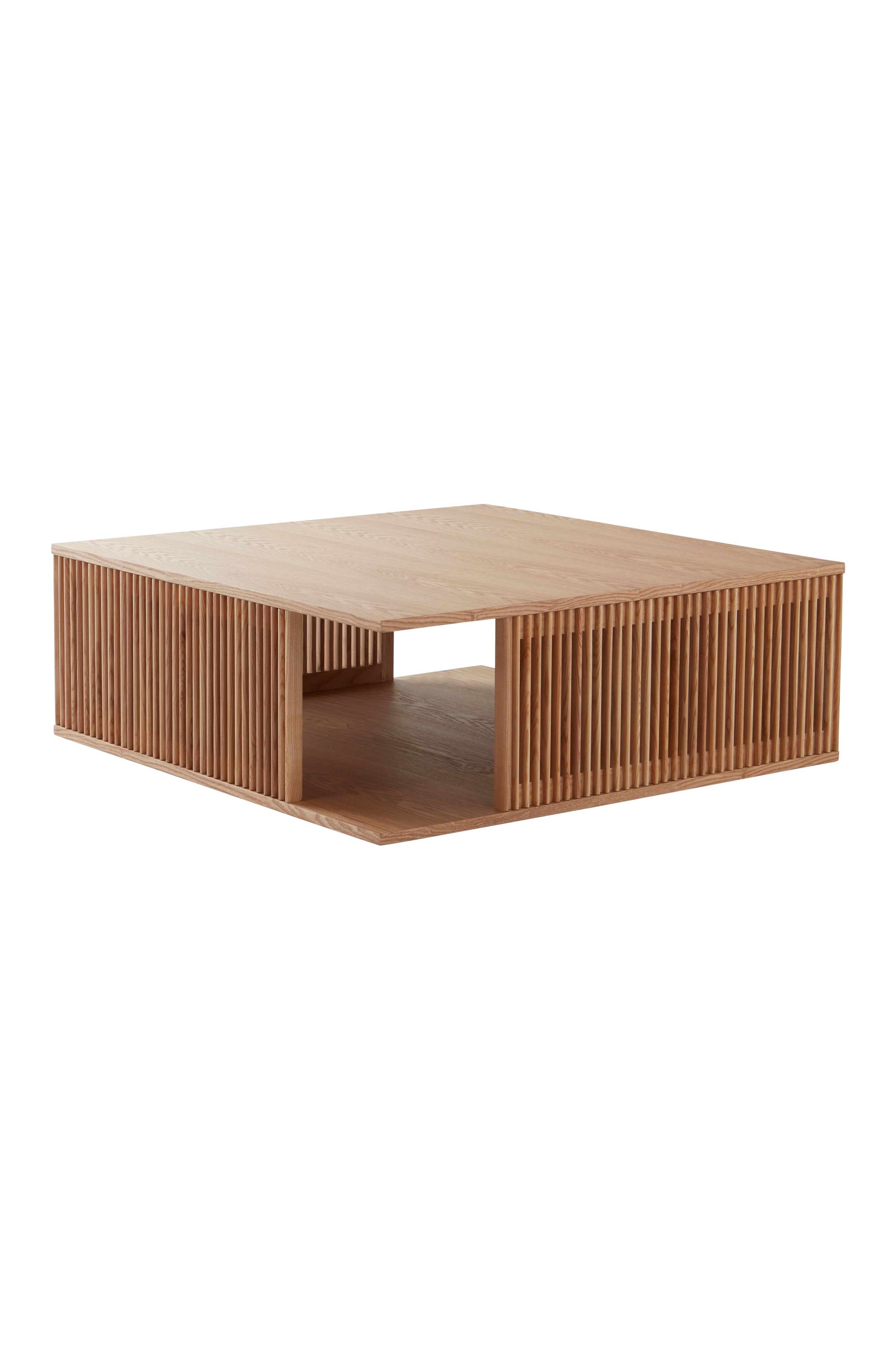 Neliönmuotoinen sohvapöytä, jossa pystysuorat massiivisaarnirimat ympäriinsä. Pöytälevy ja runko saarniviilutettua MDF-levyä. Pöytä luo luonnollista tunnelmaa skandinaavisella, aavistuksen retrohenkisellä tyylillään. Kauniissa saarnirimoissa on pyöristetyt reunat, ja rimojen välissä on pieni rako. Jokaisella sivulla on aukko, joten voit käyttää pöydän alustaa säilytystilana.