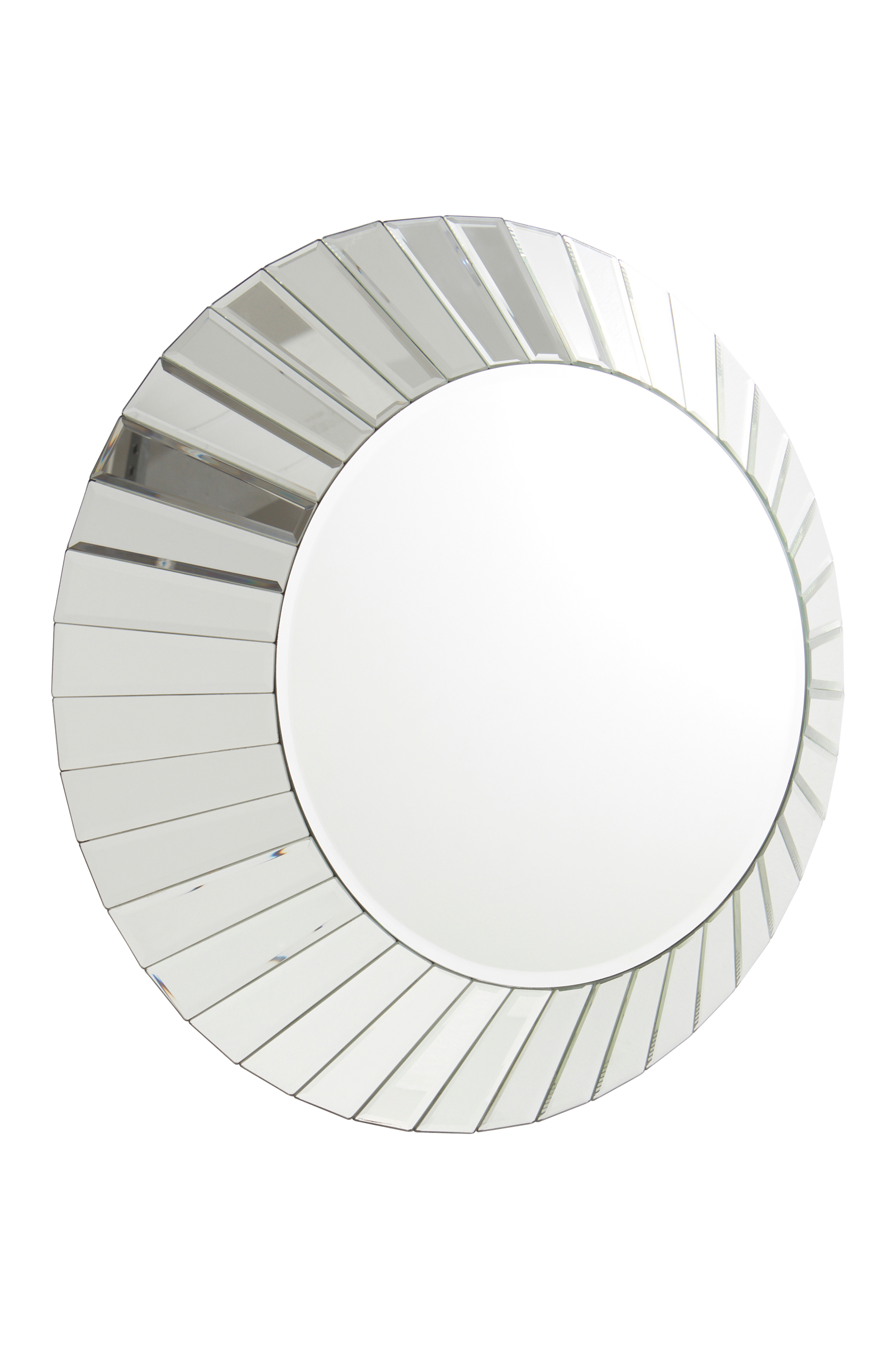 Pyöreä peili, jossa mielenkiintoinen muoto. Peilin ympärillä oleva kehys koostuu pitkistä kapeista peilimosaiikeista, jotka muodostavat kauniin kehyksen samalla, kun peili tulee hieman ulos seinästä. Runko FSC-sertifioitua MDF-levyä. Takana kaksi metallirengasta ripustusta varten.