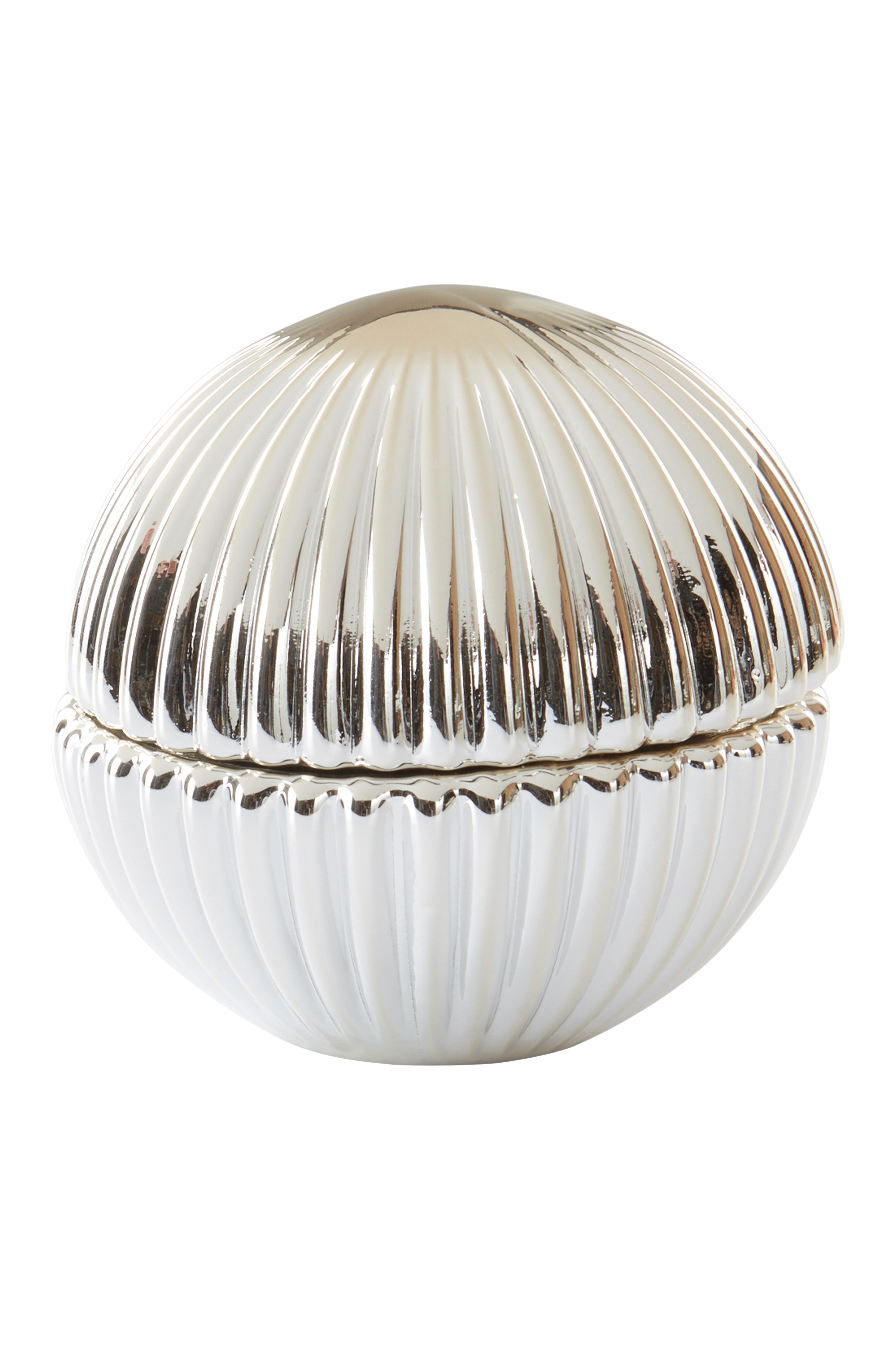 Kynttilänjalka hopeanväristä lasia. Struktuuriraidat ylhäältä alas asti. Kynttilänjalan yläosa on kansi ja alaosa pieni säilytyskulho. Tilaa kynttilä erikseen.