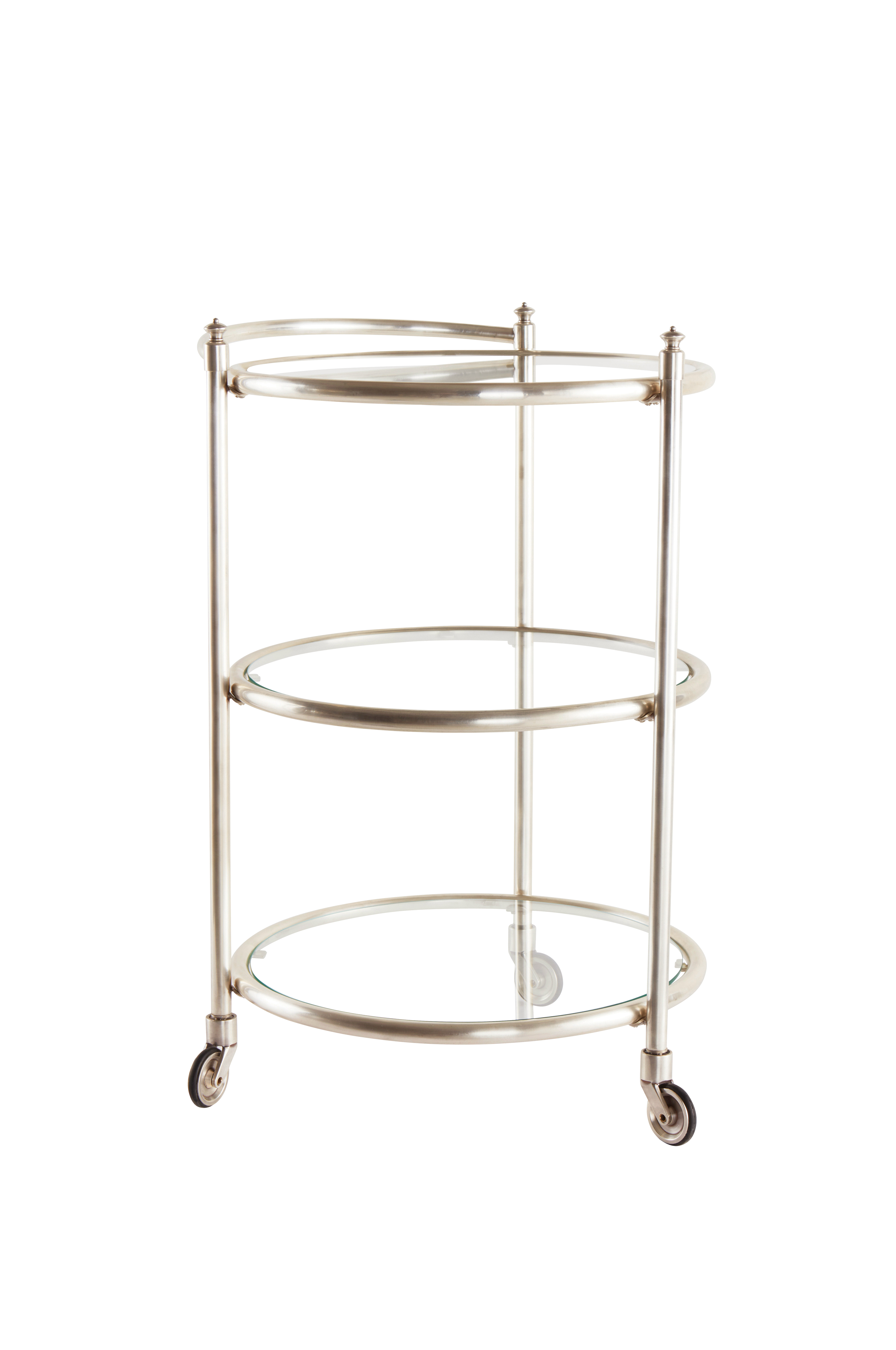 Tyylikäs ja kätevä, pyöreä tarjoiluvaunu antiikkihopeanväristä metallia. Kolme lasihyllyä. Kolme pyörää. Sopii hyvin myös kylpyhuoneeseen ja märkätiloihin. Osittain koottava. Kokoamisohje mukana.