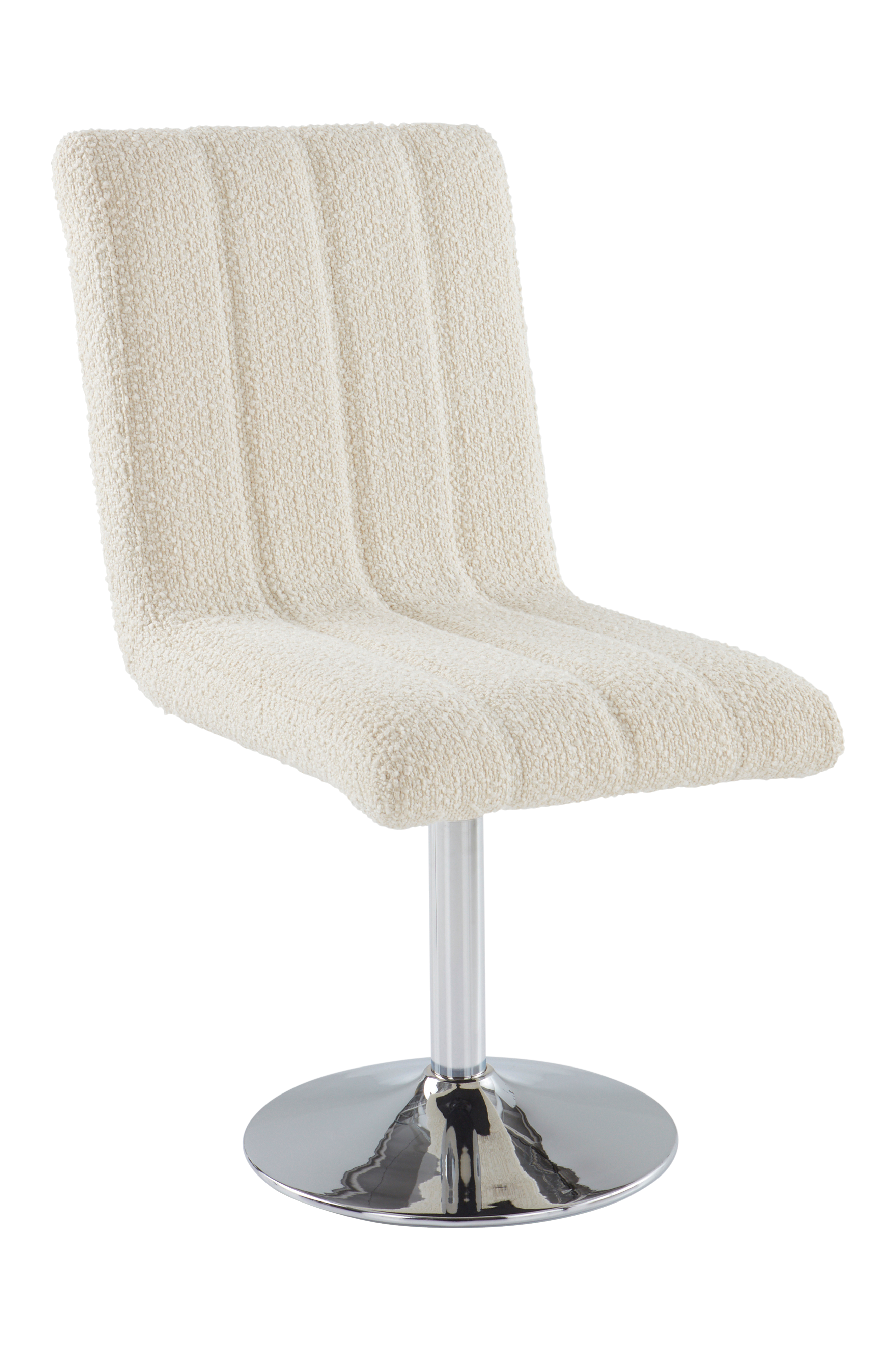Pyörivä TERRENO-tuoli on huonekalumaailman helmi. Mukavassa ja linjakkaassa istuinosassa on pehmeä ja hienostunut bukleepäällinen. Jalka on kromattu parhaaseen retrotyyliin. Hienosta polyesteribukleesta valmistettu päällinen on kestävä, ja sen Martindale-arvo on 40 000. TERRENO sopii hyvin huolella valitun ruokapöydän ääreen tai tuo persoonallista tyyliä kotitoimistoon. Tuoli pyörii kevyesti ja on mukava istua. Osittain koottava. Kokoamisohje mukana.