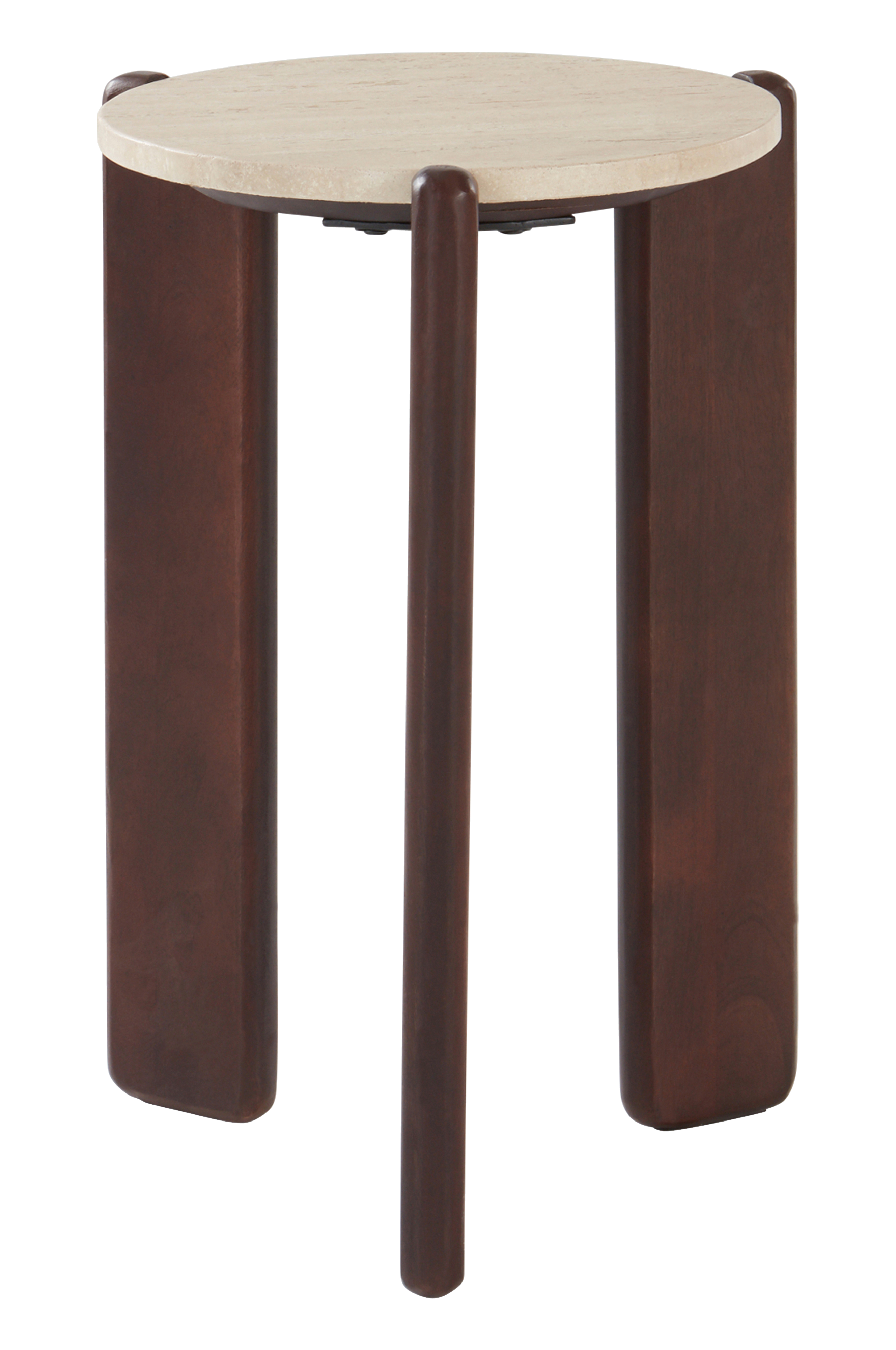 TILOU on pyöreä sivupöytä, jossa on tyyliä ja asennetta. Pöytälevy on travertiinia, luonnonkiveä, jossa voi olla pieniä onteloita ja joka on väriltään kauniin juovikasta.