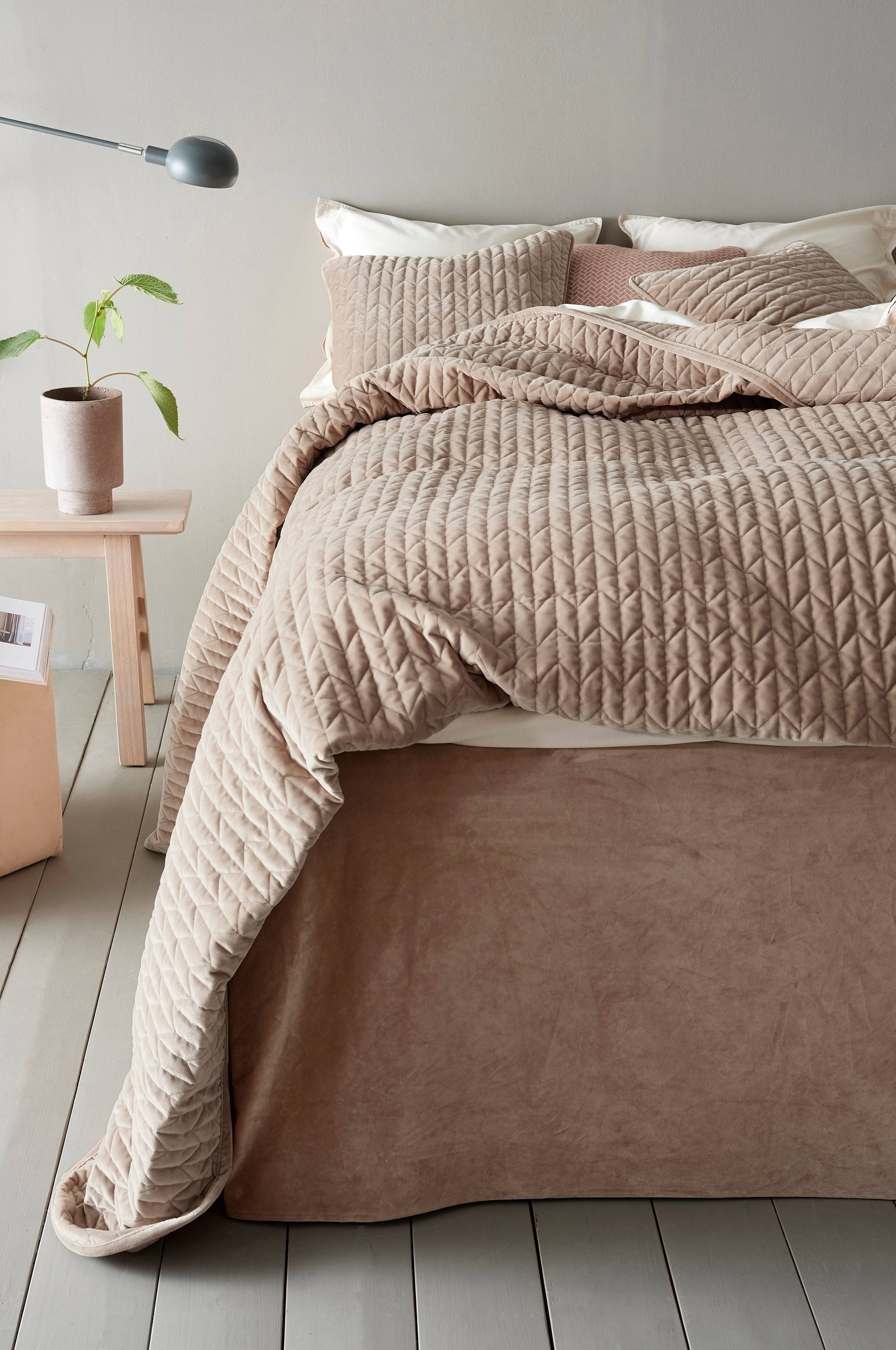 Vuodevaatepakkaus, jossa päiväpeite tikattua samettia. Koristesaumat ja terereuna ympäriinsä.