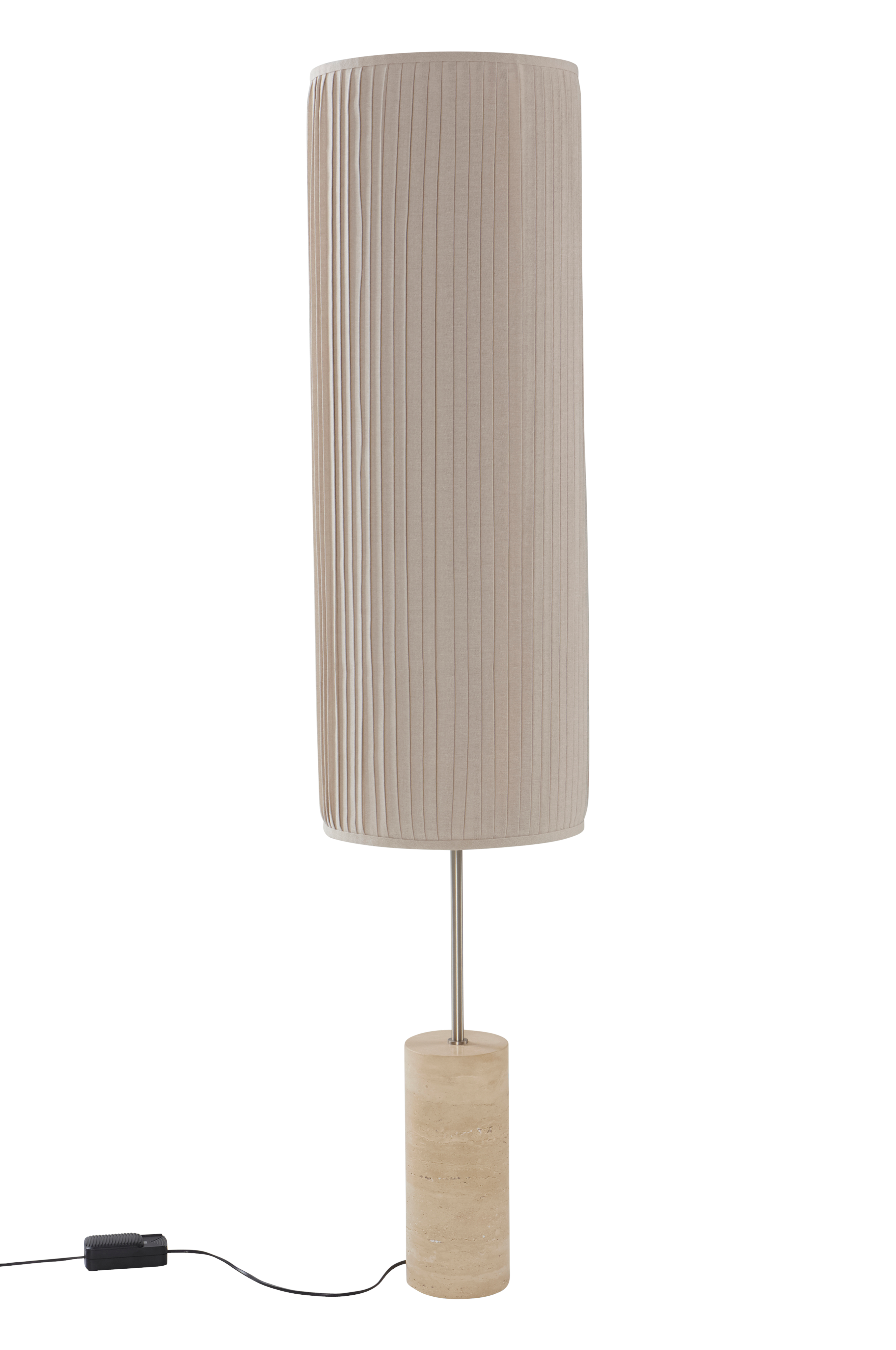 TINE-lattiavalaisimessa yhdistyvät moderni eleganssi ja luonnonmateriaalit. Valaisimessa on travertiinijalusta ja laskostettu puuvillavarjo, ja se tarjoaa hienostuneen estetiikan, joka sopii mihin tahansa asuintilaan. Sen musta PVC-johto, jossa on sisäänrakennettu jalkahimmenninkytkin, mahdollistaa mukautettavan valaistuksen.