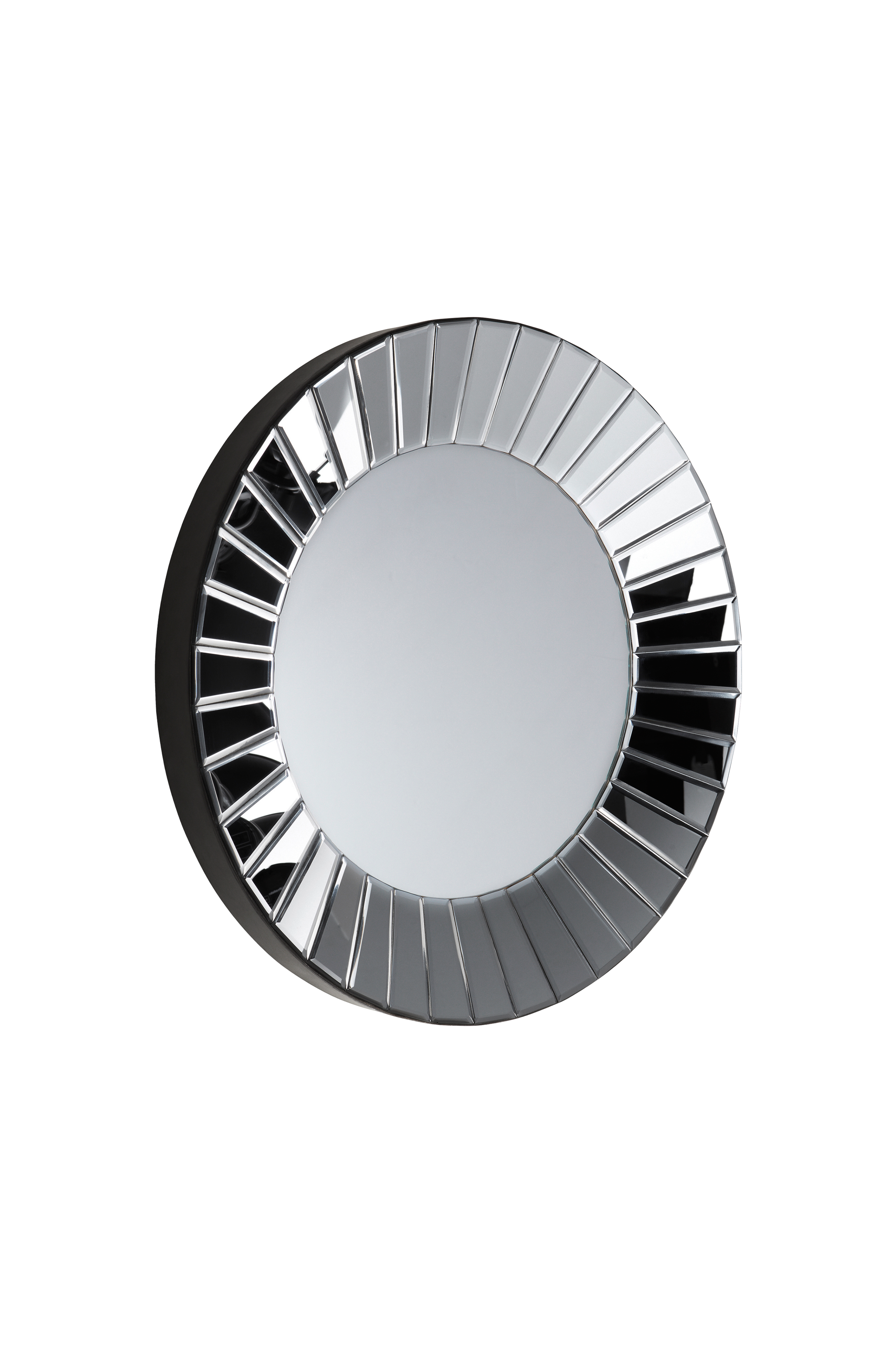 Pyöreä peili, jonka takaosa MDF-levyä ja ympärillä hieman ulospäin käännetty koristekehys peililasia.