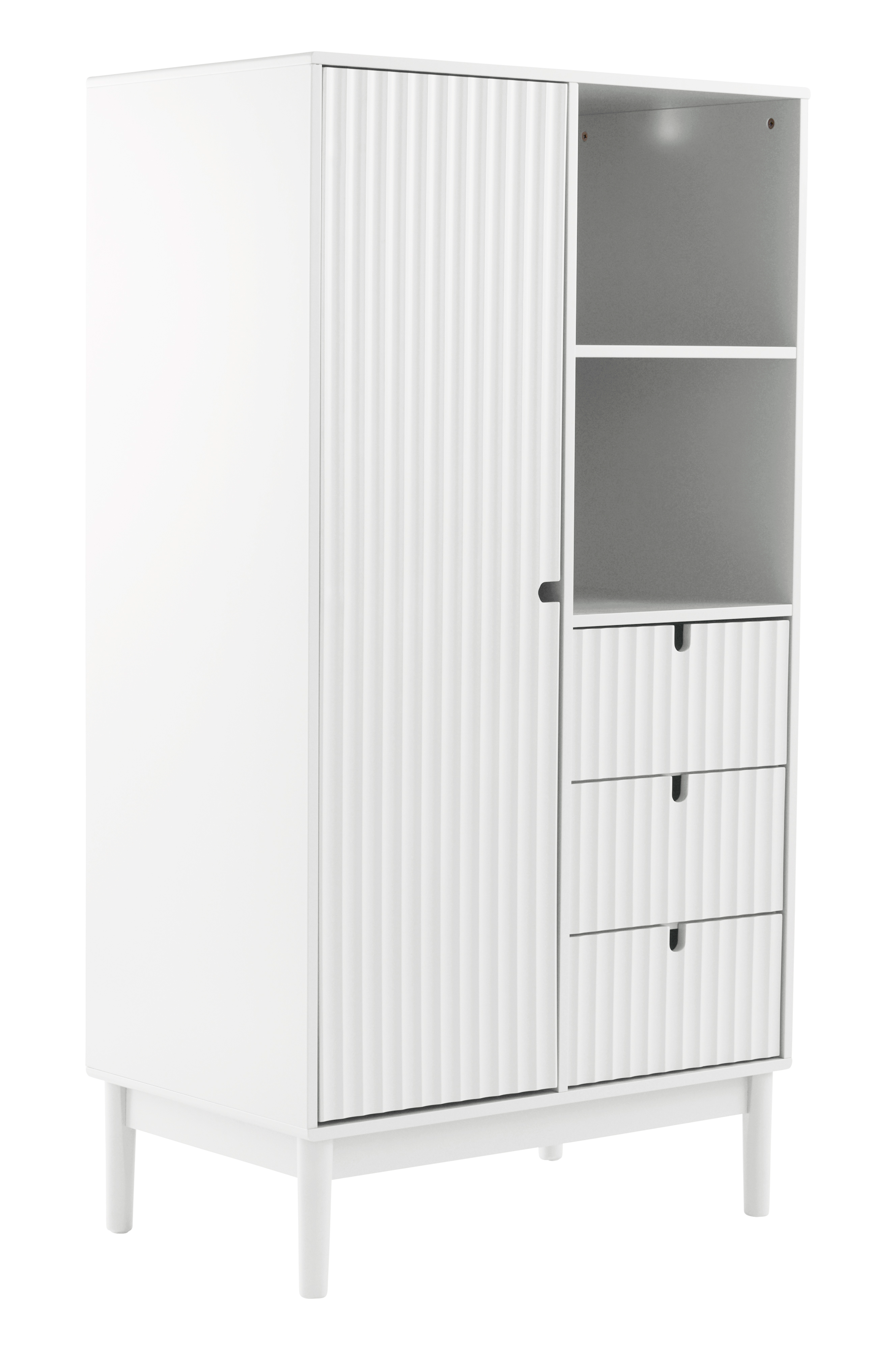 Vaatekaapin vasemman oven takana on kaappiosa, jonka yläosassa on kiinteä hylly ja hyllyn alla metallinen vaatetanko ripustimia varten (ripustimet eivät ole mukana). Pehmeästi sulkeutuvat saranat. Vaatekaapin oikealla puolella on kaksi avohyllyä ja niiden alapuolella kolme laatikkoa. Laatikoiden yläreunassa on kaiverrettu aukko, mikä helpottaa niiden avaamista. Seinäkiinnikkeet ylhäällä takana.