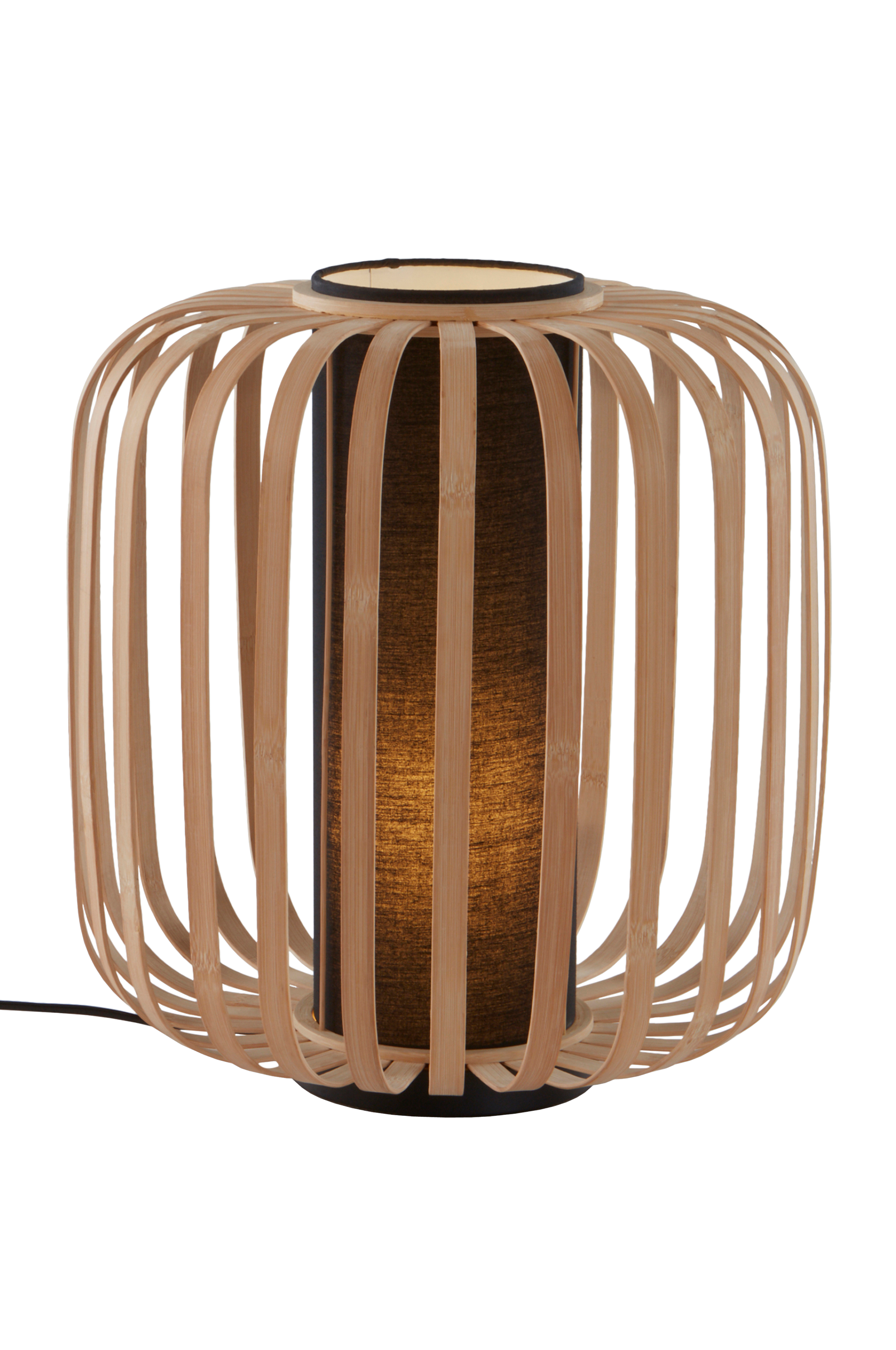 Pöytävalaisimessa on metallipohja ja musta kangasvarjostin sekä kapeat luonnonbambuiset rimat ympäriinsä, jotka yhdessä luovat koristeellisen valon. Musta muovijohto, jossa virtakatkaisin.