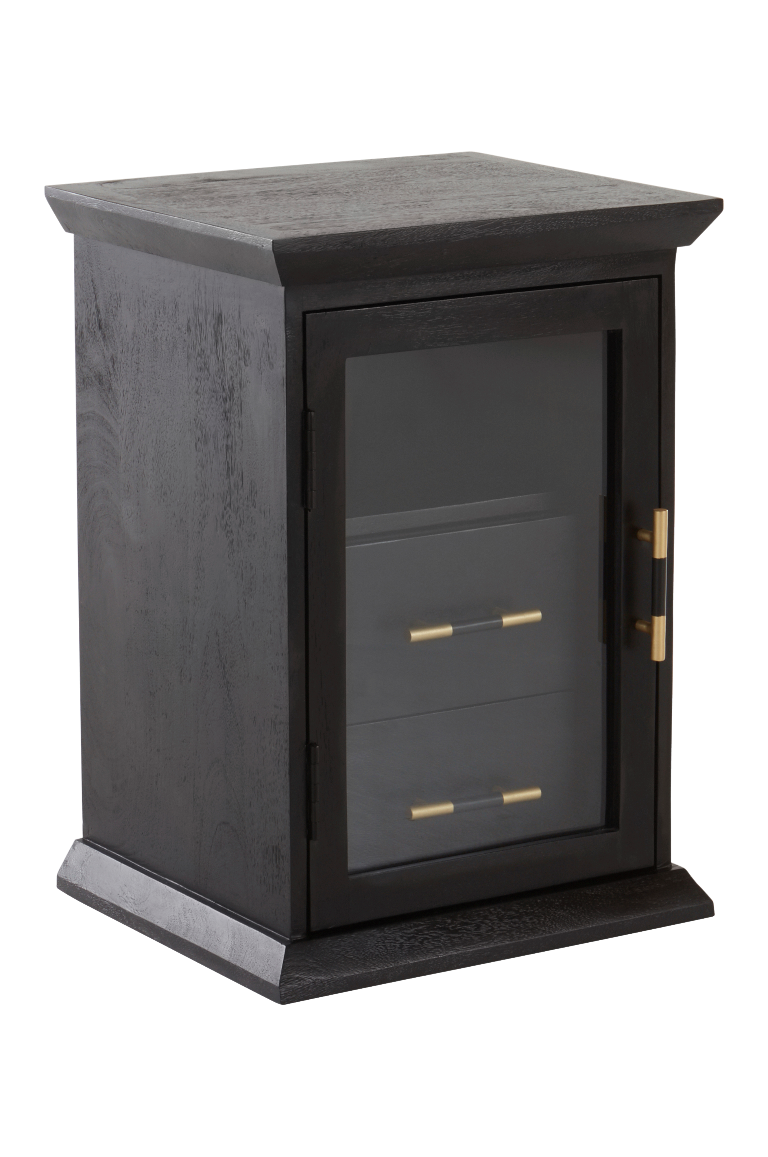 TRUNK-yöpöytä mangopuuta ja MDF-levyä. Lasiovi. Yöpöydän ylä- ja alareunassa on reunalista ja sisällä kaksi laatikkoa. Kiinteä sisäosa, jonka päälle luodaan hylly. Ovi ja laatikot avataan kaksisävyisten metallikahvojen avulla. Ovessa on magneettilukko. Käytännöllinen yöpöytä antaa mukavasti säilytystilaa sängyn viereen.