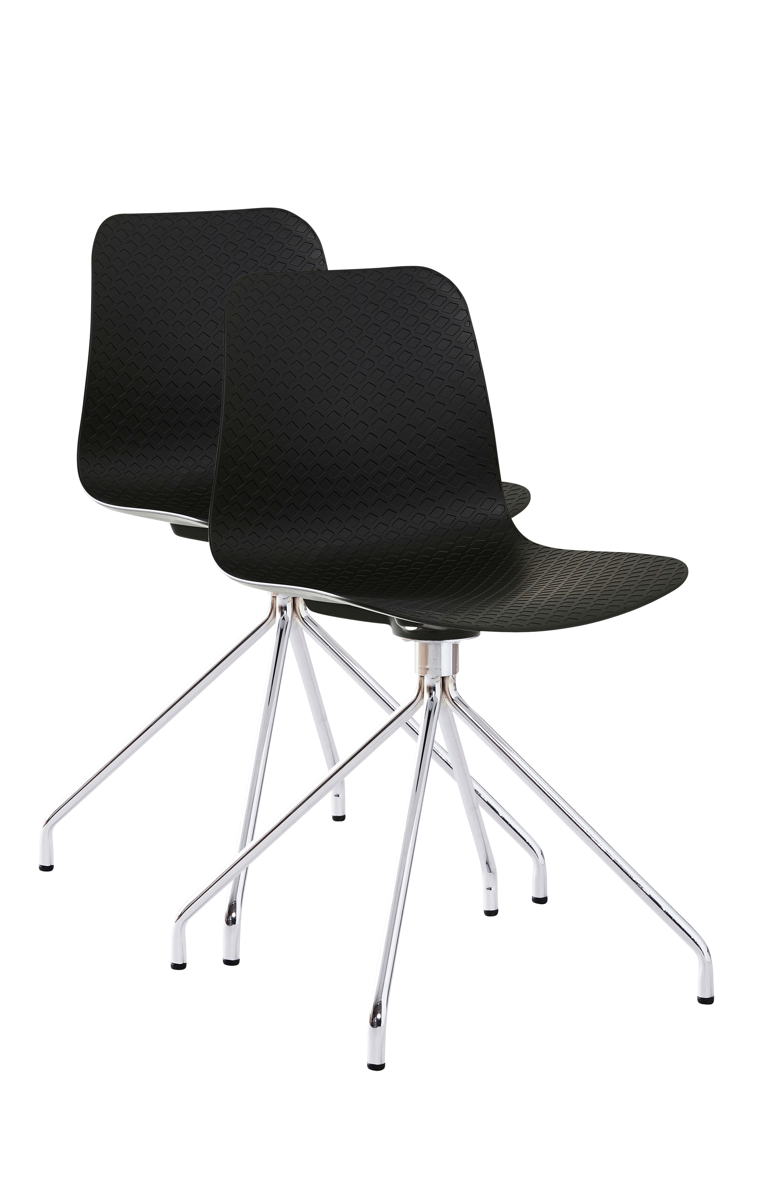 2 tuolia, joissa muotoonvalettu istuin ja metallijalat. Mustassa tuolissa on mustaksi maalatut teräsjalat. Moderni tuoli, jonka pyöreät muodot houkuttelevat istumaan koko illallisen ajan ja pitkään sen jälkeenkin. Ei pyörivä. Osittain koottava.