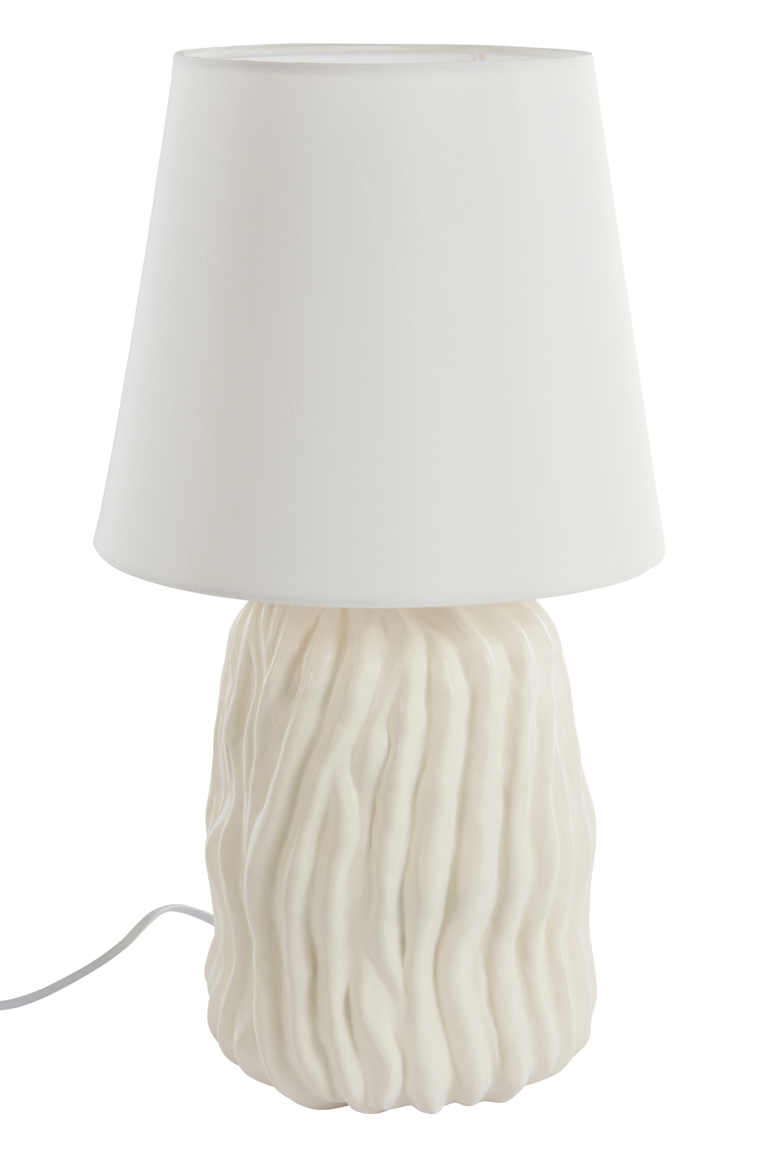 Pöytävalaisin, jossa pehmeän muotoinen lampunjalka polyresiiniä ja sileä valkoinen kangasvarjostin. Varjostimessa on metallirunko ja lampunpidike on krominväristä metallia. Virtakatkaisin valkoisessa johdossa. Valaisin on maadoittamaton, luokka 2.