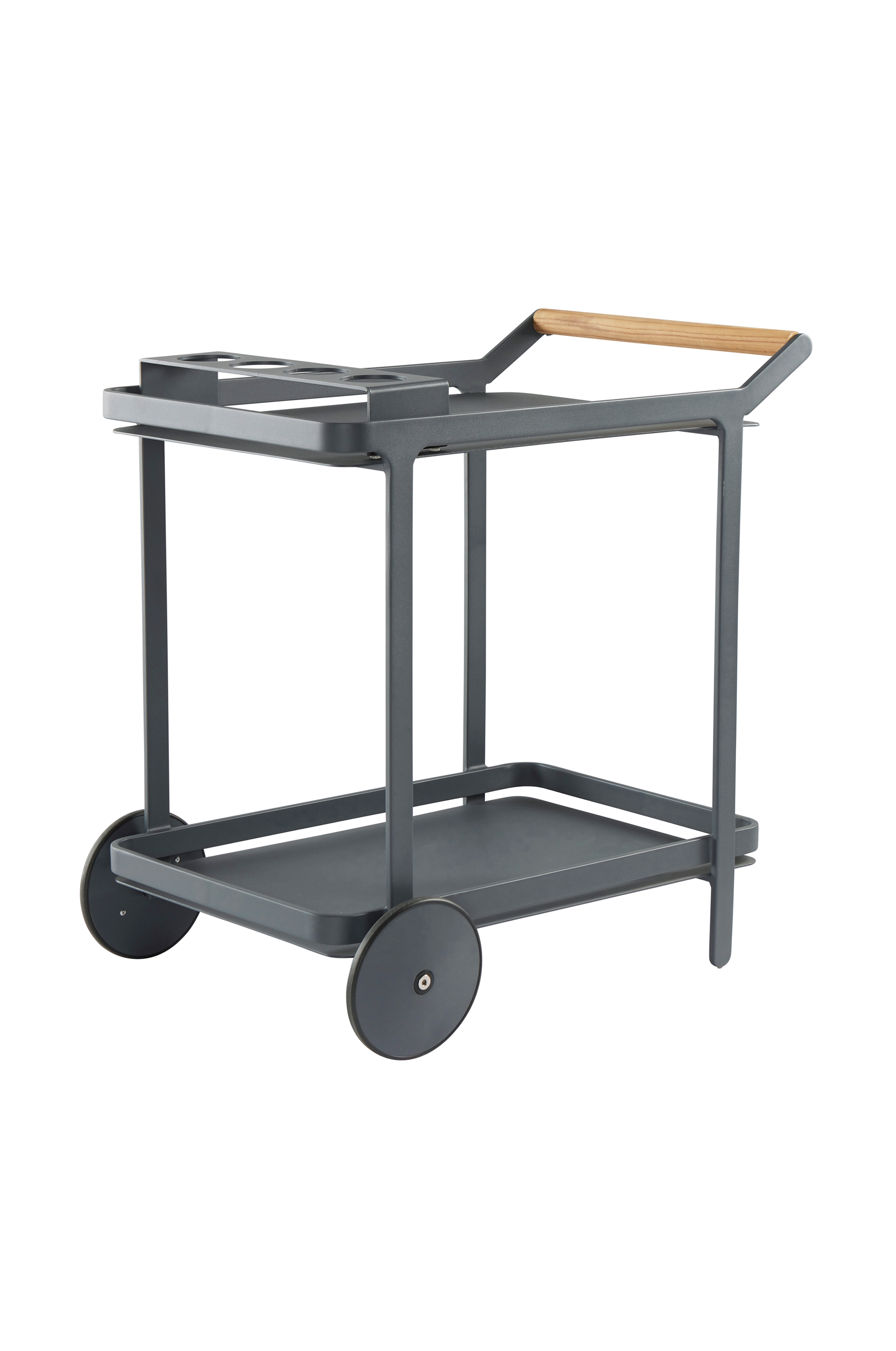Tarjoiluvaunu jauhemaalattua, mattapintaista alumiinia. Mukava, pyöreä ja puinen työntöaisa. VENEZIA on kätevä terassilla helpottamassa pöytään tarjoilua tai laskutasona grillin vieressä. Tarjoiluvaunun mukana toimitetaan siihen täydellisesti sopiva, kätevä pidike neljälle lasille tai pullolle. Pidikkeen voi sijoittaa mihin vain vaunuissa. Etupyörät tekevät vaunujen työntämisestä helppoa - nostat ylös ja työnnät eteenpäin. Kahden pyörän ja kahden jalan ansiosta tarjoiluvaunu pysyy vakaasti paikoillaan. Alumiini on hyvä, kestävä ja ruostumaton materiaali ulkokäyttöön. Osittain koottava.