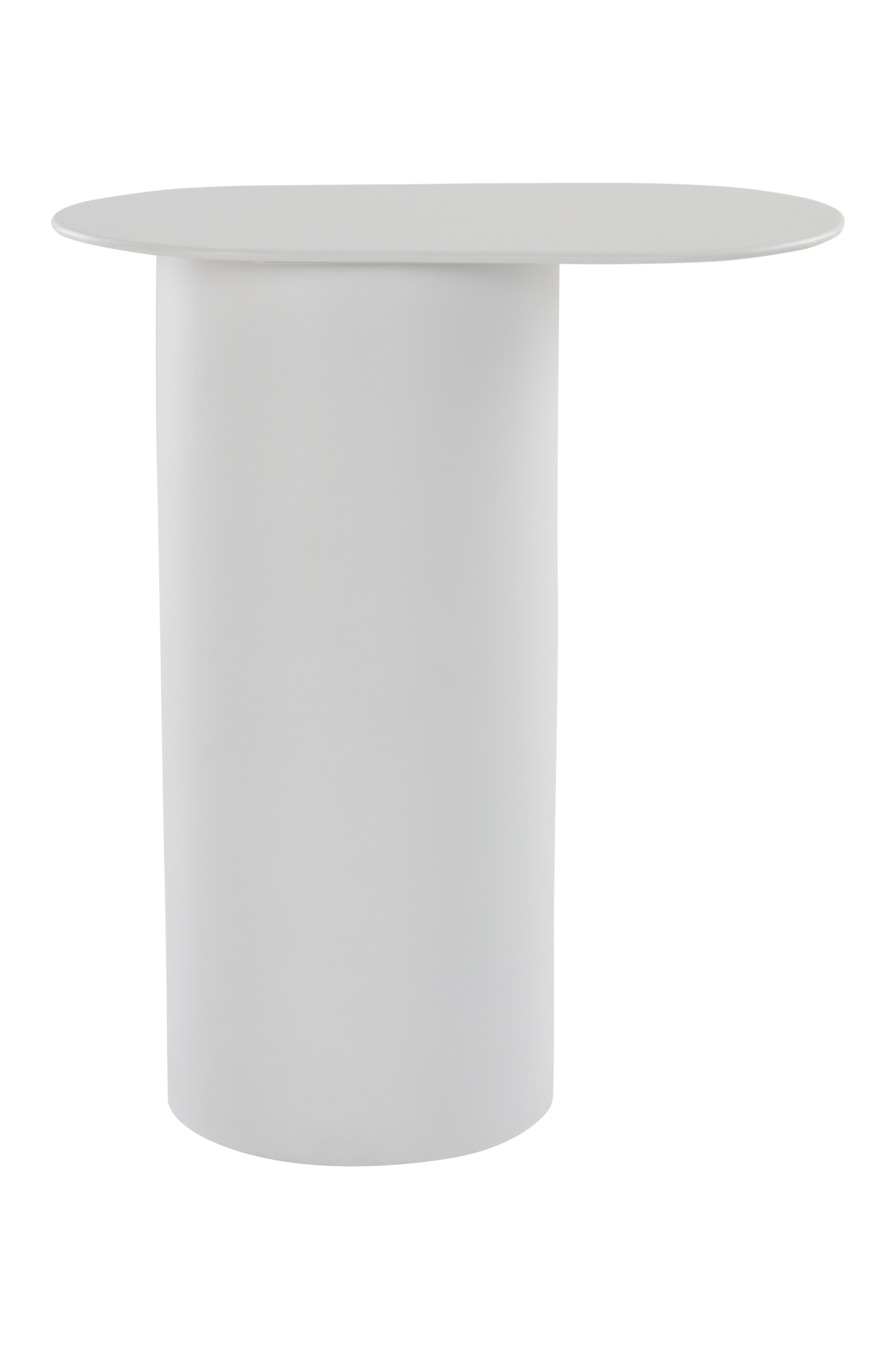 Rautainen sivupöytä, jossa on epäsymmetrinen pöytälevy epäsymmetrisen pyöreän jalan päällä. Yksivärinen sivupöytä, jossa jauhemaalattu mattapinta. Joskus yllättävä voi olla paras.