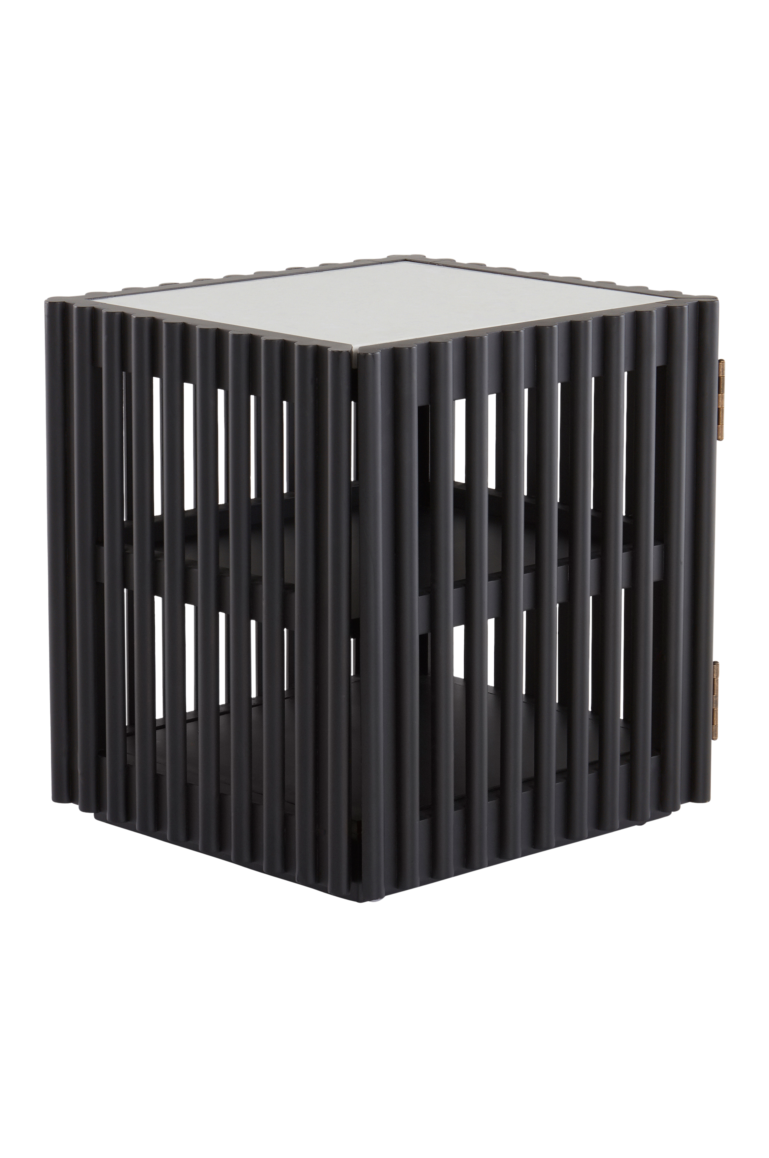 Yöpöytä FSC-merkittyä pyökkiä, pöytälevy Terrazzoa - tyylikäs yhdistelmä. Yöpöydän sivut ja ovi on verhoiltu pyörein rimoin, mikä antaa yöpöydälle tyylikkään ilmeen ja tietyn läpinäkyvyyden. Pöydän sivuihin upotettu Terrazzo-levy on tyylikäs yksityiskohta. Yöpöytä on tukeva ja vakaa ja siinä on yksi kiinteä hyllytaso, joka tarjoaa hyvän säilytystilan sängyn viereen. Ovessa ei ole vedintä, vaan se avataan push-toiminnolla. Puupinnat on maalattu vesipohjaisella maalilla.
