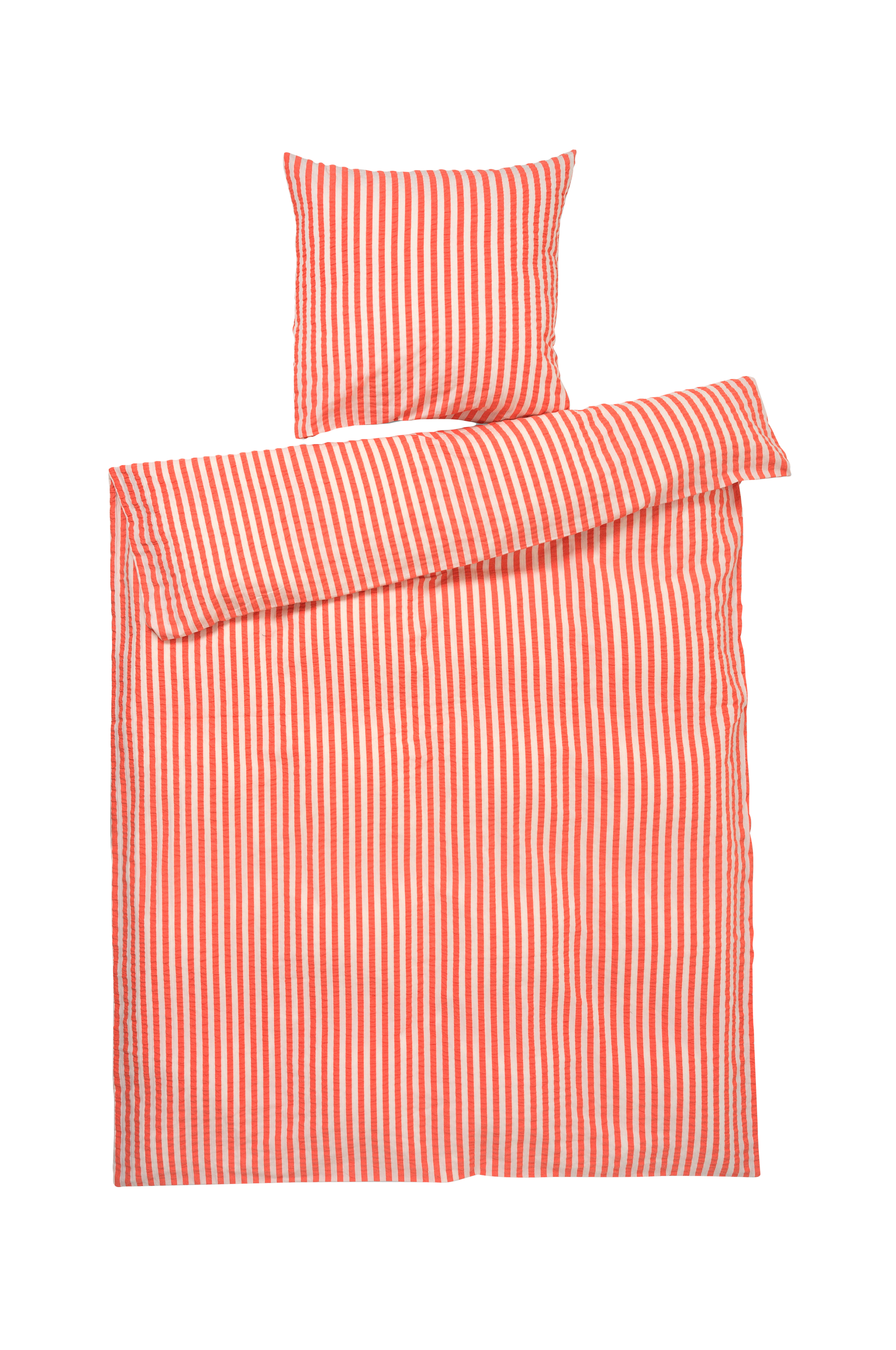 Sängyssä vietetään monta tuntia yössä, joten ympäröivillä kankailla on merkitystä. Juna-pussilakanasetti on sensuelli, mukava, 100% ekologinen ja kestävä, jotta voit nukkua mukavasti joka yö. Juna sisältää ajatuksen elämästä ja elämän ilonaiheista nauttimisesta vuodevaatteilla, jotka tekevät elämästä entistä kauniimpaa, pehmeämpää, värikkäämpää ja hauskempaa. Siksi kuviot ja värit saavat näkyvyyttä Juna-muotoilussa ja auttavat tuomaan vuodevaatteisiin viihtyisää ja rentoa tunnelmaa. Tunnetussa ja klassisessa raidallisessa kankaassa on modernit värit - nostalgisen ja modernin tunteen yhdistelmä luo ainutlaatuisen ja miellyttävän Juna-tunnelman makuuhuoneeseen. Raidallisen chilin-/koivunvärisen Bæk & Bølgen kaunis kesäväri muistuttaa raidallisia vintage-lepotuoleja ja -aurinkovarjoja. Materiaali on 100% ekologista ja OEKO-TEX®-merkittyä puuvillaa GOTS-sertifioitu,. Tyynyliinassa on kirjekuorisuljenta, ja pussilakana suljetaan napeilla. Jos kotonasi on jo muita Juna-pussilakanasettejä, voit yhdistellä eri värejä ja kuvioita ja luoda oman yksilöllisen ja leikkisän tyylisi makuuhuoneeseen. Kankaan kudontatavan ansiosta Bæk & Bølgessa on lainekreppirakenne, joka antaa ilman kiertää ihon ja peiton välillä - täydellinen lämpiminä kesäöinä. Ilmankierto auttaa sinua nukkumaan hyvin ja heräämään levänneenä ja valmiina uuteen päivään. Kreppimateriaalista valmistettuja vuodevaatteita ei tarvitse silittää tai mankeloida, joten voit vain antaa lämpimän kesätuulen kuivattaa vuodevaatteet ja hakea ne suoraan pyykkinarulta, kun vaihdat vuodevaatteet.
