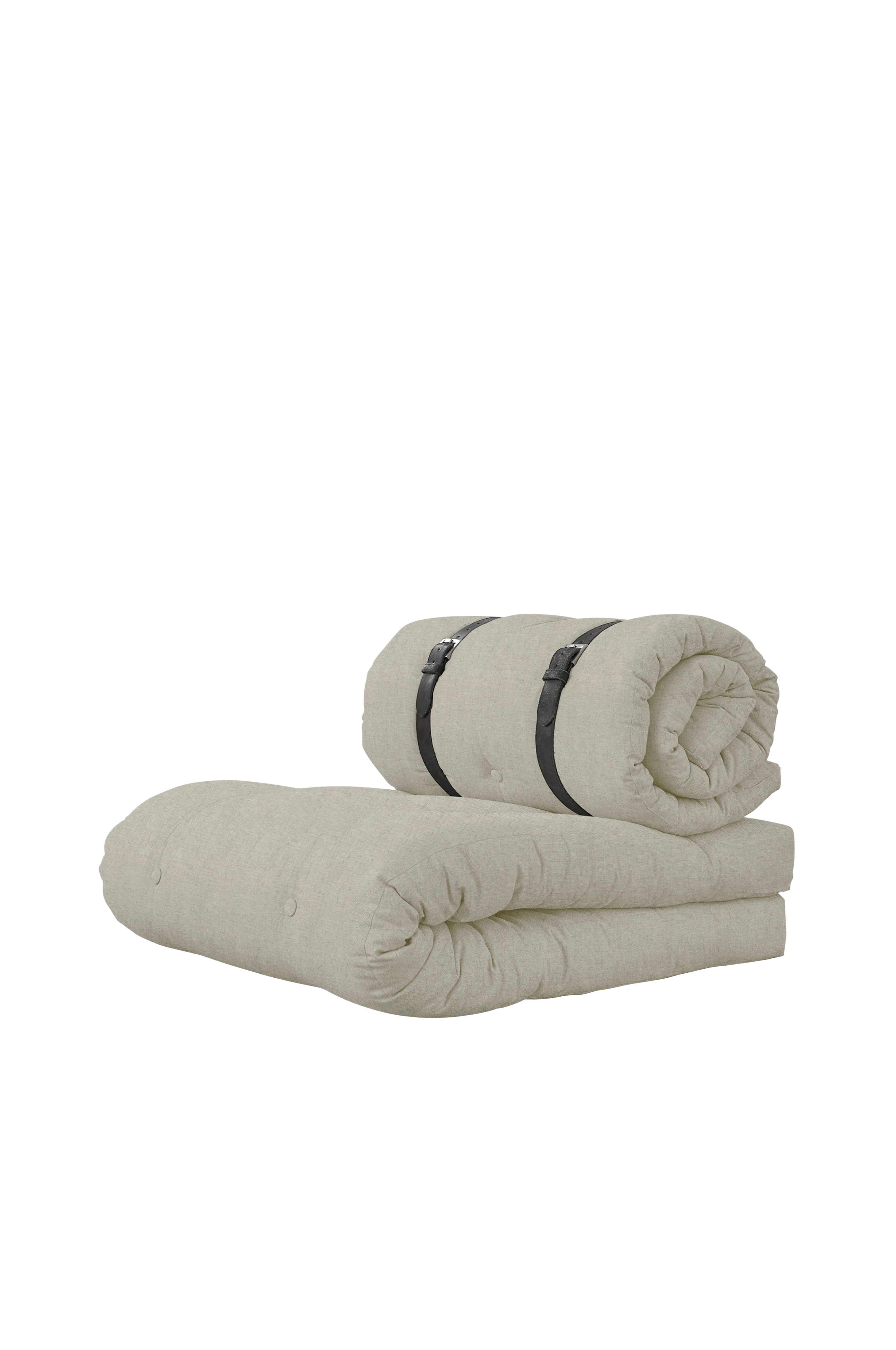 Sit. Roll. Sleep. - Buckle-Up muuntuu modernista istumapaikasta käytännölliseksi vierasvuoteeksi kolmella yksinkertaisella liikkeellä. Levität vain istuinpatjan suoraksi, avaat rullatun selkätuen ja asetat molemmat futonpatjat päällekkäin ylellisen muhkeaksi vuoteeksi, joka tukee kehoa mukavasti läpi yön. Futonpatjamme ovat tavallista leveämpiä ja paksumpia. Buckle-Up on erittäin käytännöllinen, tyylikäs ja kompakti ratkaisu pieneenkin asuntoon.