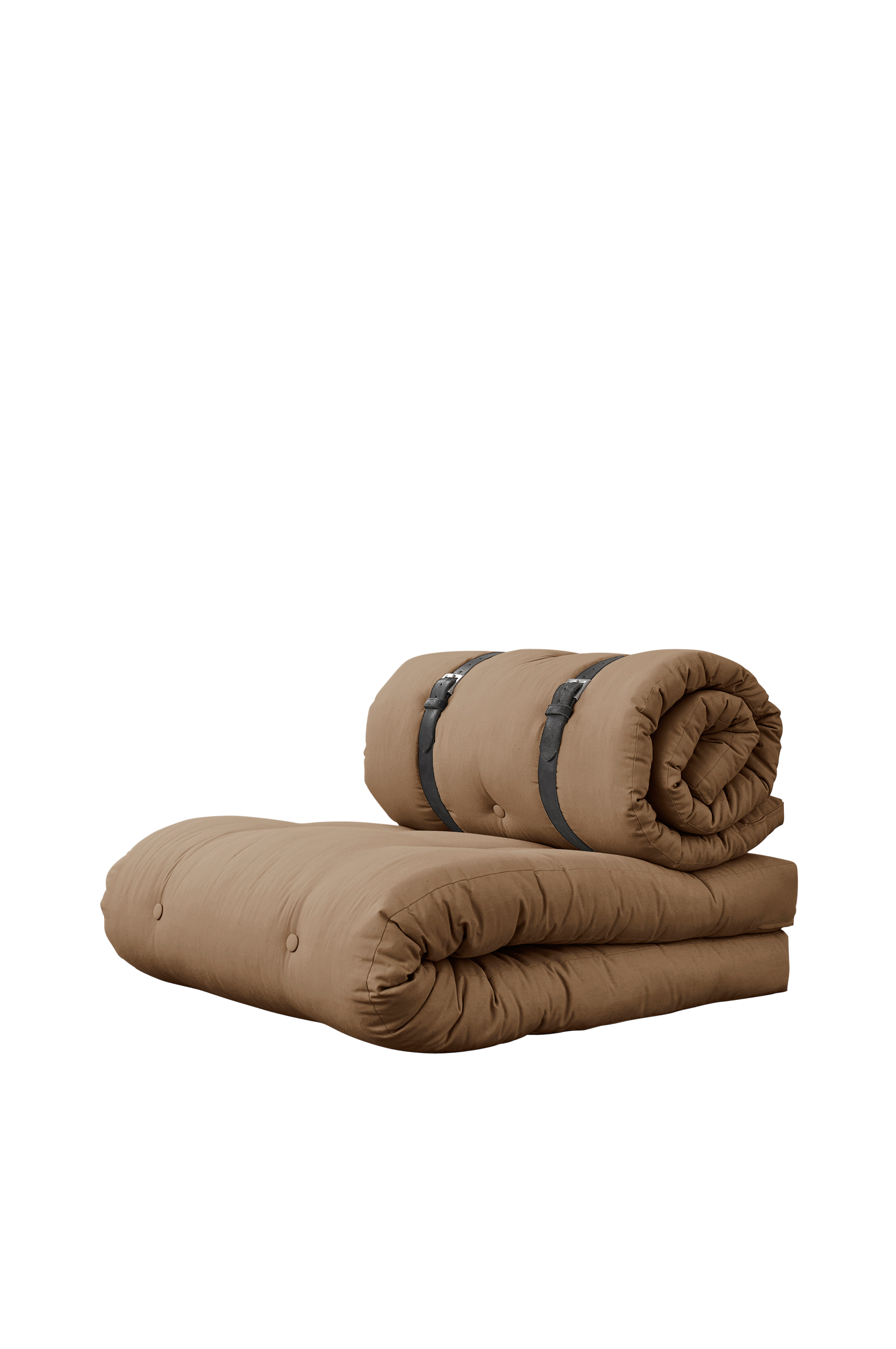 Sit. Roll. Sleep. - Buckle-Up muuntuu modernista istumapaikasta käytännölliseksi vierasvuoteeksi kolmella yksinkertaisella liikkeellä. Levität vain istuinpatjan suoraksi, avaat rullatun selkätuen ja asetat molemmat futonpatjat päällekkäin ylellisen muhkeaksi vuoteeksi, joka tukee kehoa mukavasti läpi yön. Futonpatjamme ovat tavallista leveämpiä ja paksumpia. Buckle-Up on erittäin käytännöllinen, tyylikäs ja kompakti ratkaisu pieneenkin asuntoon.