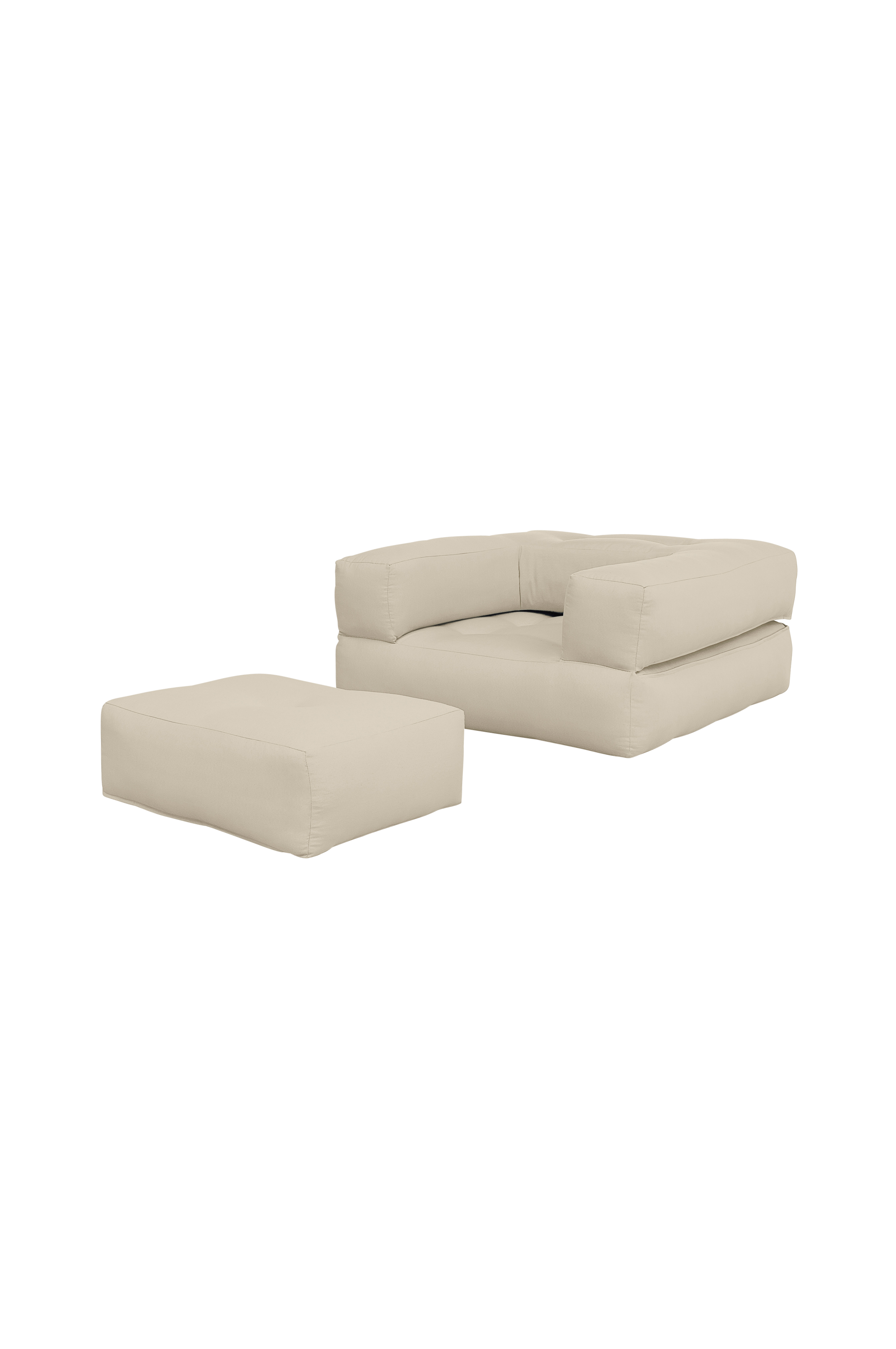 Don't. Be. Square. - Geometrisestä muodostaan huolimatta Cube on kaikkea muuta kuin kaavoihin kangistunut. Käden käänteessä Cube muuntuu kolmeksi erilaiseksi huonekaluksi: matalaksi nojatuoliksi jalkaraheineen, mukavaksi vierasvuoteeksi tai korkeaksi istuintyynyksi. Suunnitellut Joseph Willet tuotemerkille Karup Design.