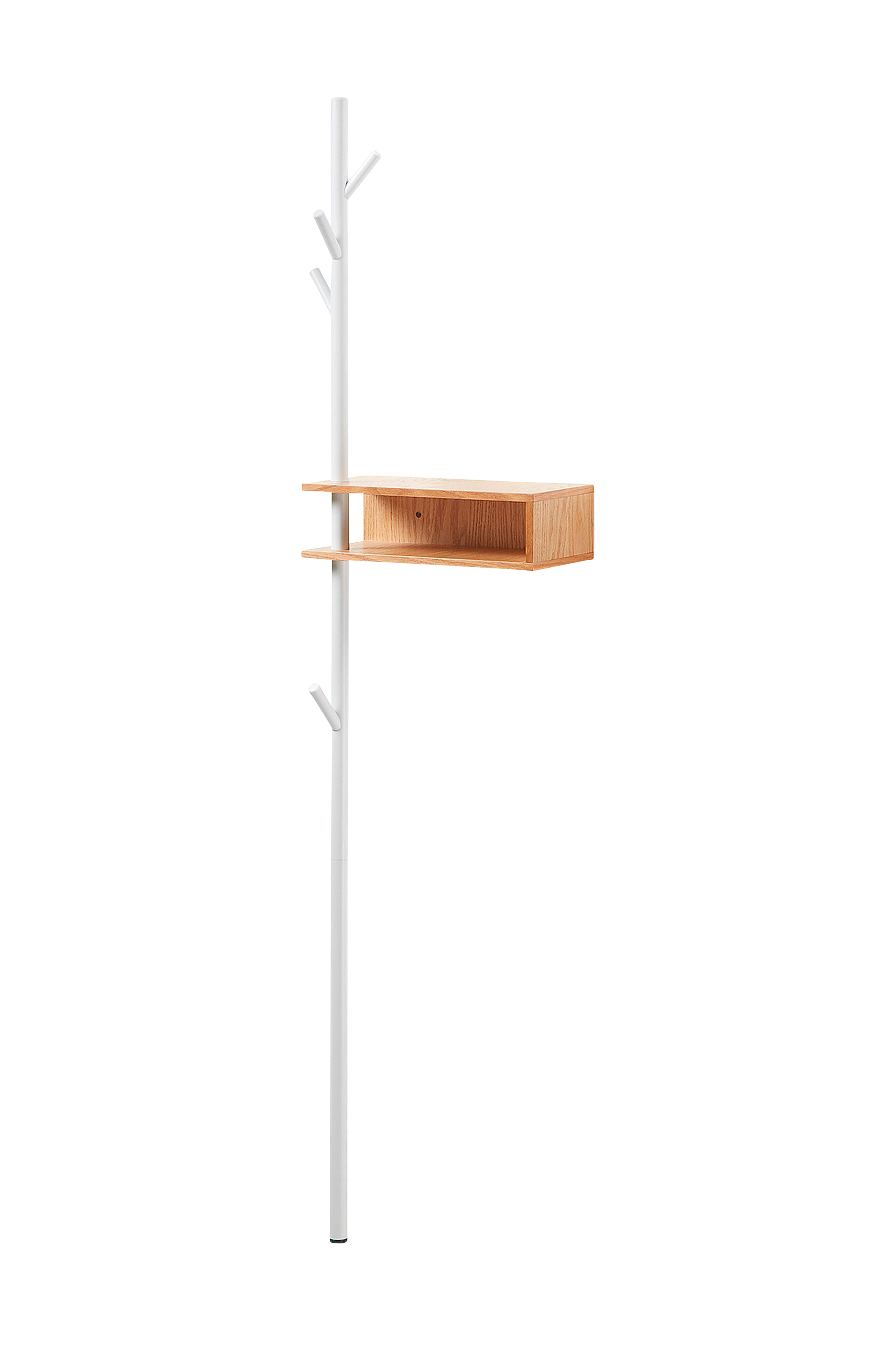 Metallirunko, jossa koukut. Hylly tammiviilutettua MDF-levyä. Korkeus 175, leveys 40 cm. Toimitetaan osina.