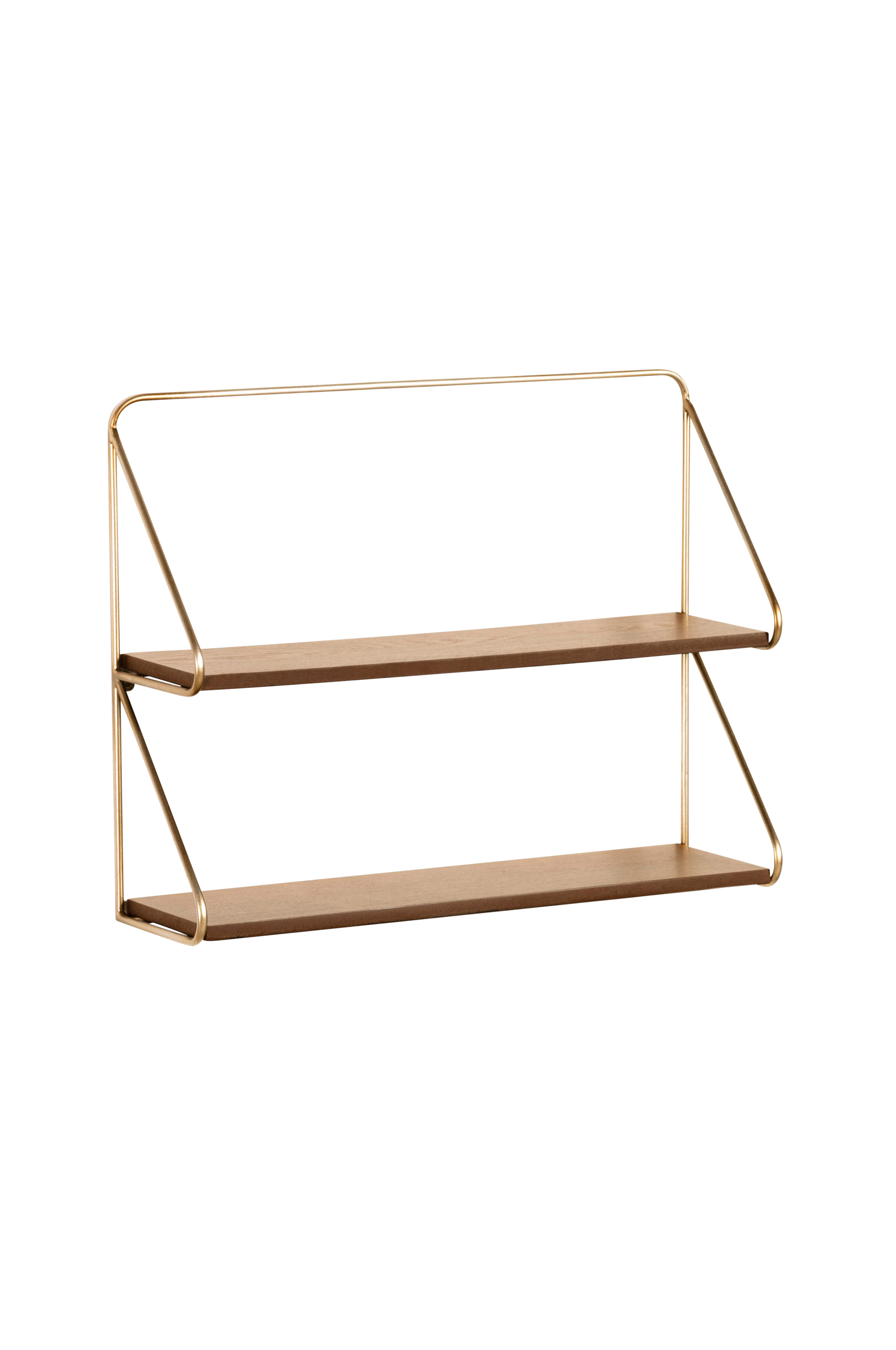 Catrina-hyllykkö, jossa kaksi puista hyllytasoa ja kullanvärinen metallirunko. Pelkistetty muoto luo kevyen ja ilmavan tunnun. Sopii rakenteensa puolesta kirjahyllyksi. Leveys: 51 cm. Syvyys: 16 cm. Korkeus: 42 cm.
